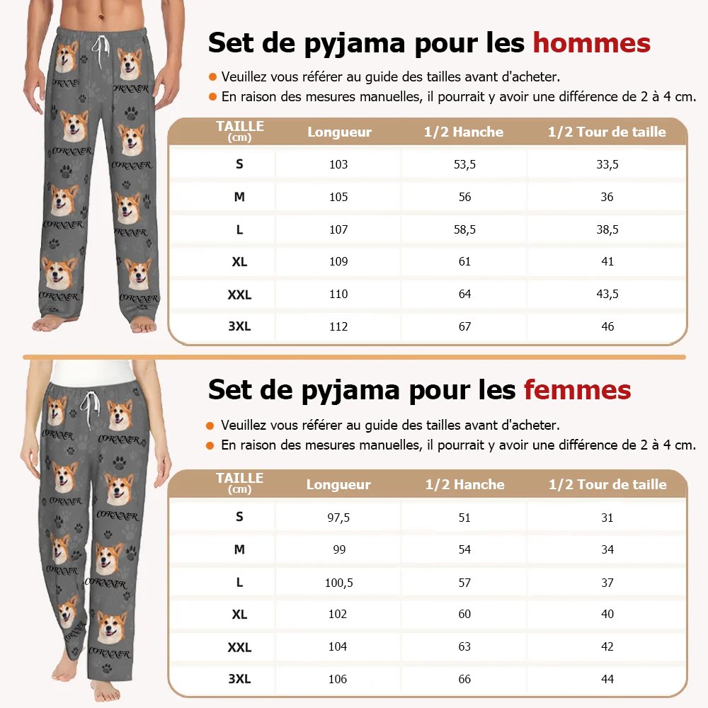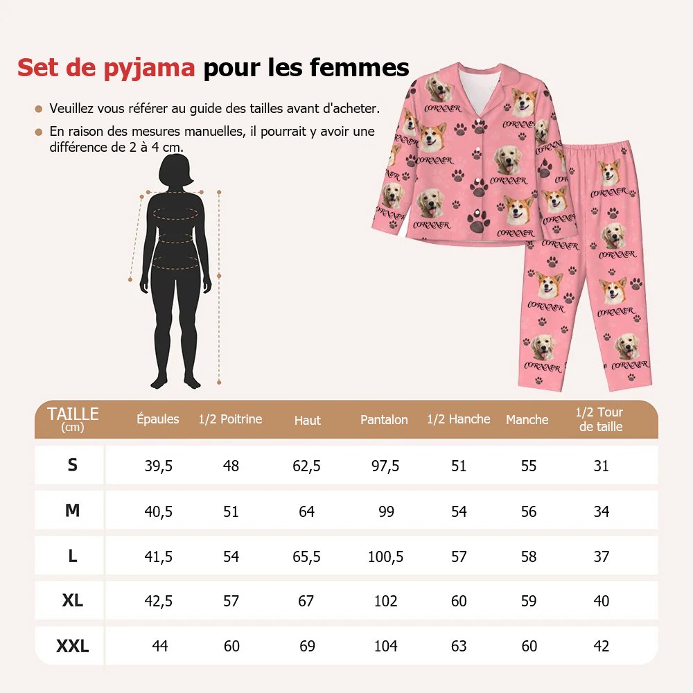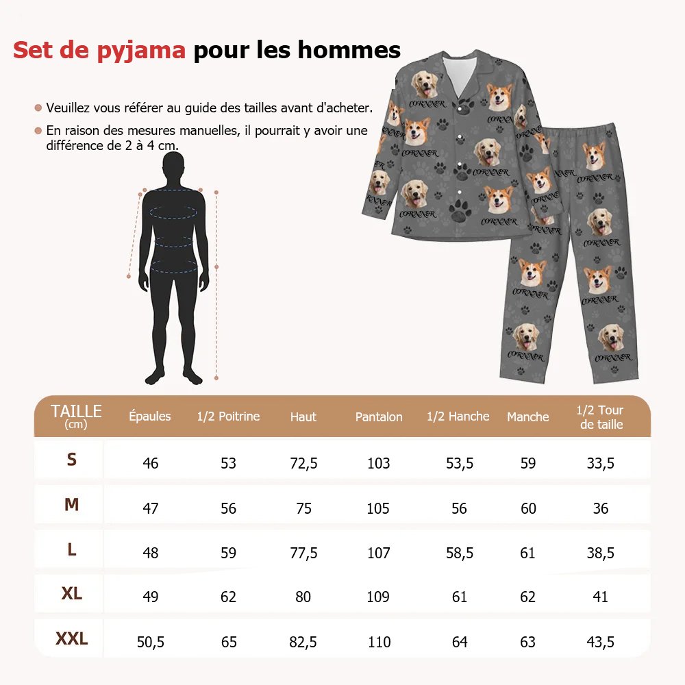 Nos pyjamas sont ornés de griffes gris foncé, ce qui les rend très attrayants. Ce modèle est parfait pour les amoureux des animaux qui apprécient les touches amusantes et personnalisées. L'ensemble peut être personnalisé avec 1 à 5 photos d'animaux et un nom, ce qui en fait une pièce unique qui reflète l'amour que vous portez à votre ami à fourrure.