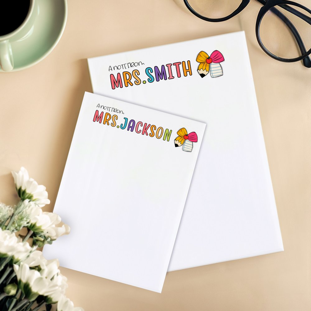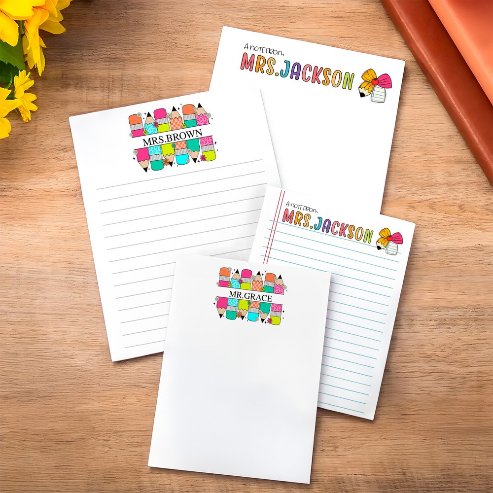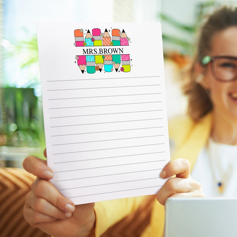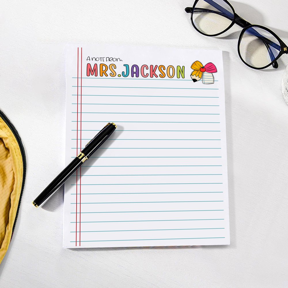 Conçu à l'intention des enseignants, ce bloc-notes est disponible non seulement en version lignée ou vierge, mais aussi en version crayon ou arc. Il peut être personnalisé avec votre nom, offrant ainsi un espace clair et organisé pour vos écrits, ce qui en fait une pièce unique.