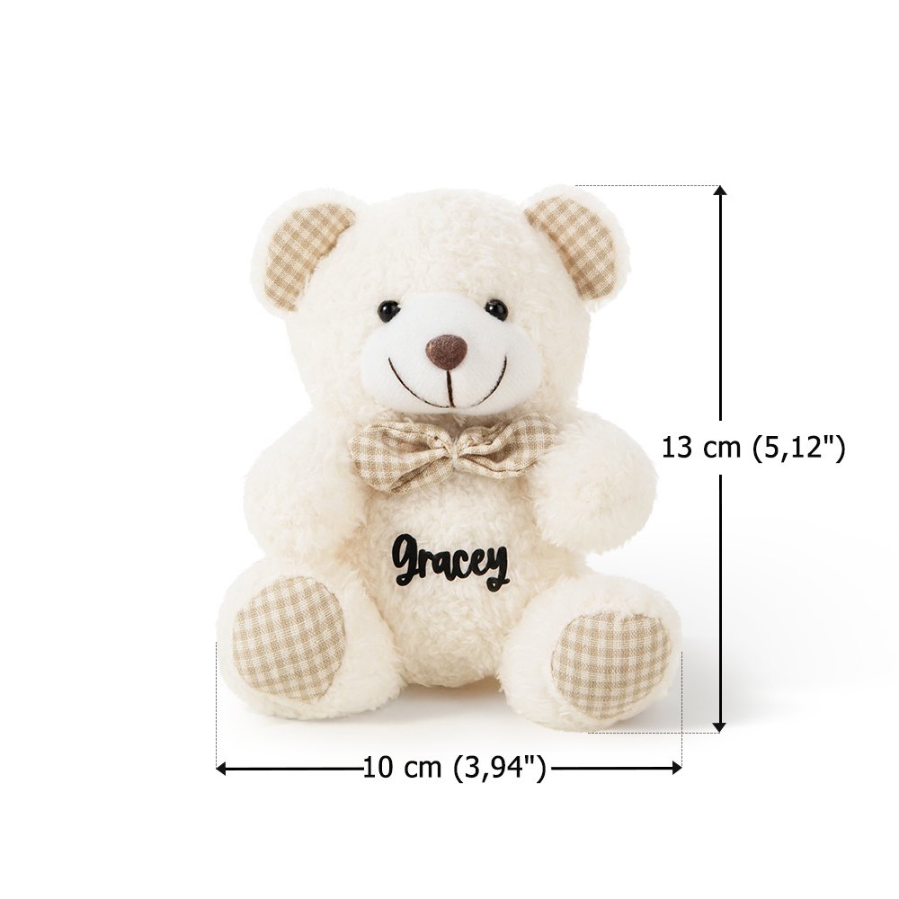 Cet ourson est un charmant compagnon de jeu conçu pour apporter joie et réconfort aux enfants de tous âges. Cet adorable ours est orné d'un élégant motif à carreaux sur les oreilles, les pattes et le nœud papillon, ce qui lui confère une touche de charme et d'originalité. Vous pouvez le personnaliser avec le nom de votre enfant, ce qui en fait un souvenir unique qui encourage un lien spécial entre votre enfant et son nouvel ami à fourrure.