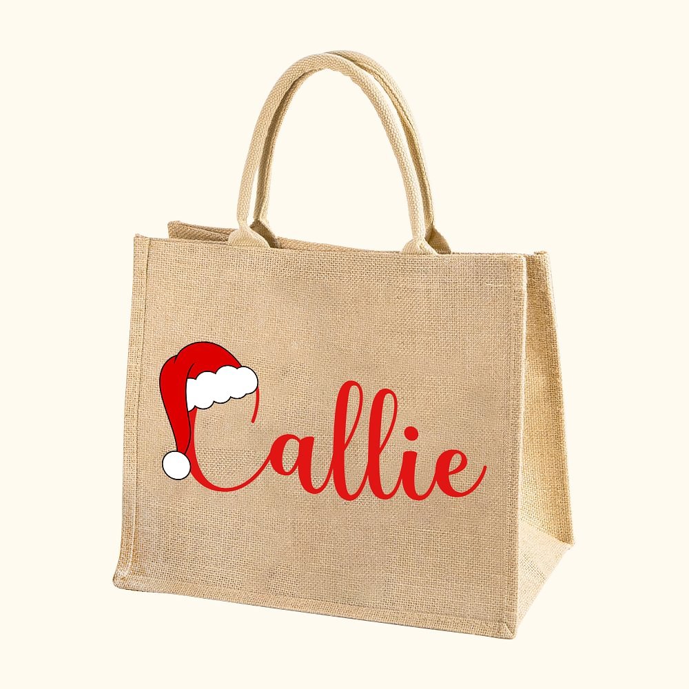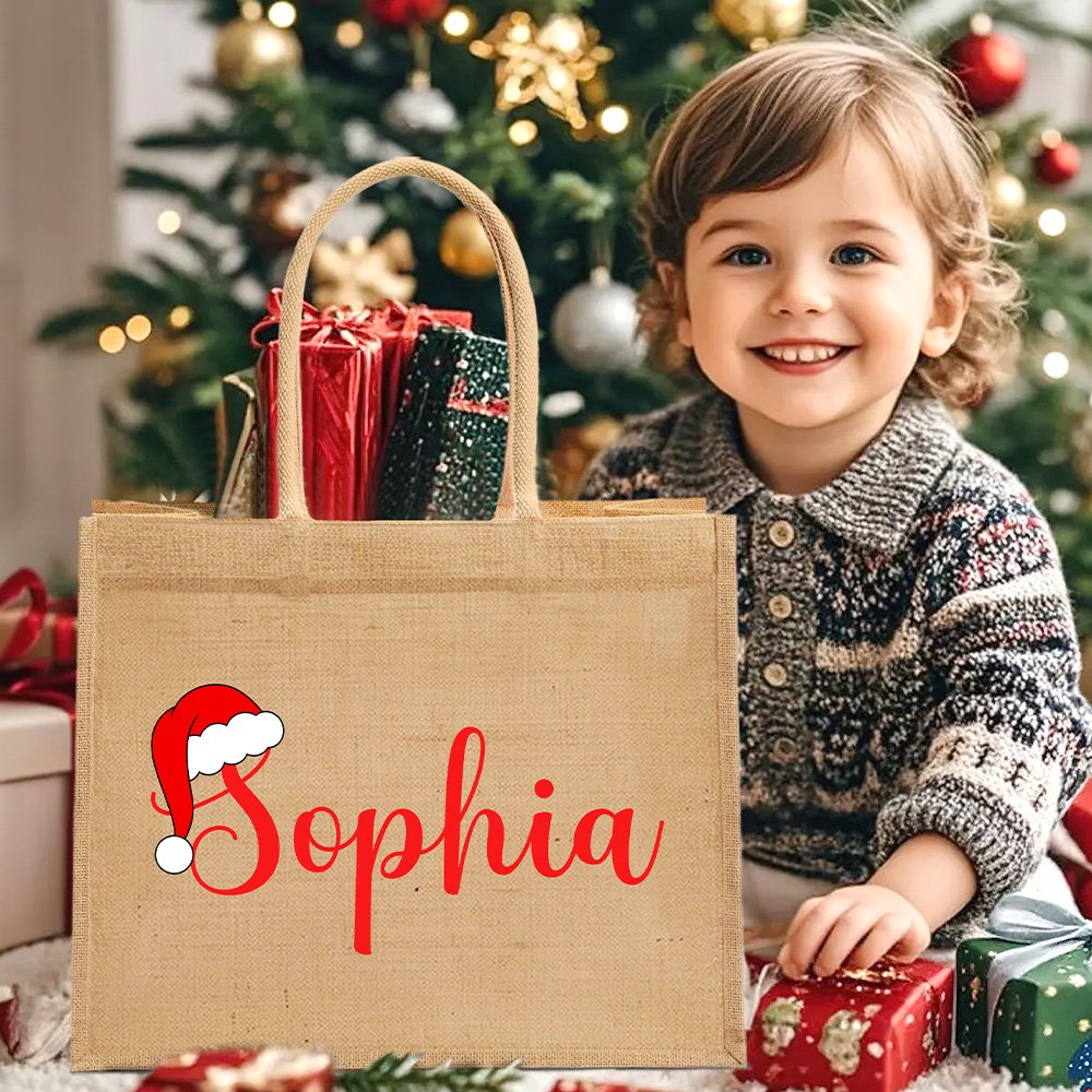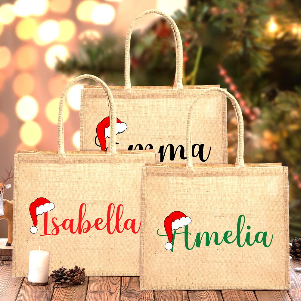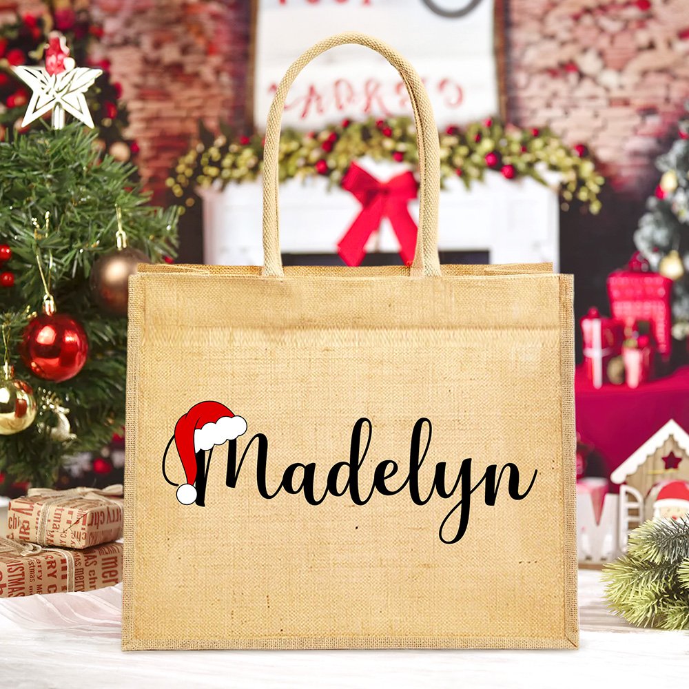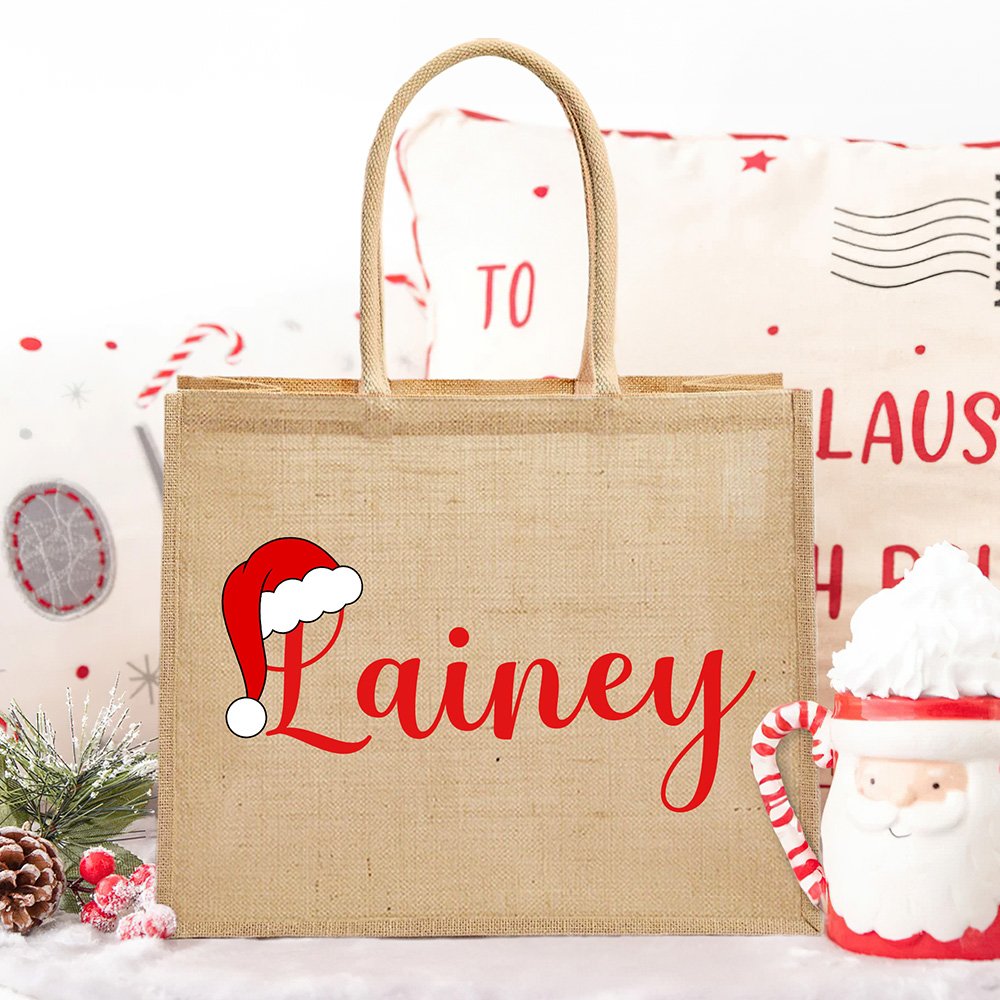 Ce charmant sac fourre-tout en toile de jute est orné d'un bonnet de Père Noël au design ludique qui reflète parfaitement l'esprit festif des fêtes de fin d'année. Personnalisez-le avec le nom du destinataire pour un cadeau vraiment unique qu'il chérira. Son design adorable en fait un accessoire charmant pour les rassemblements, les sorties shopping ou toute autre sortie de vacances, car tout le monde remarquera cet ajout amusant à sa garde-robe !