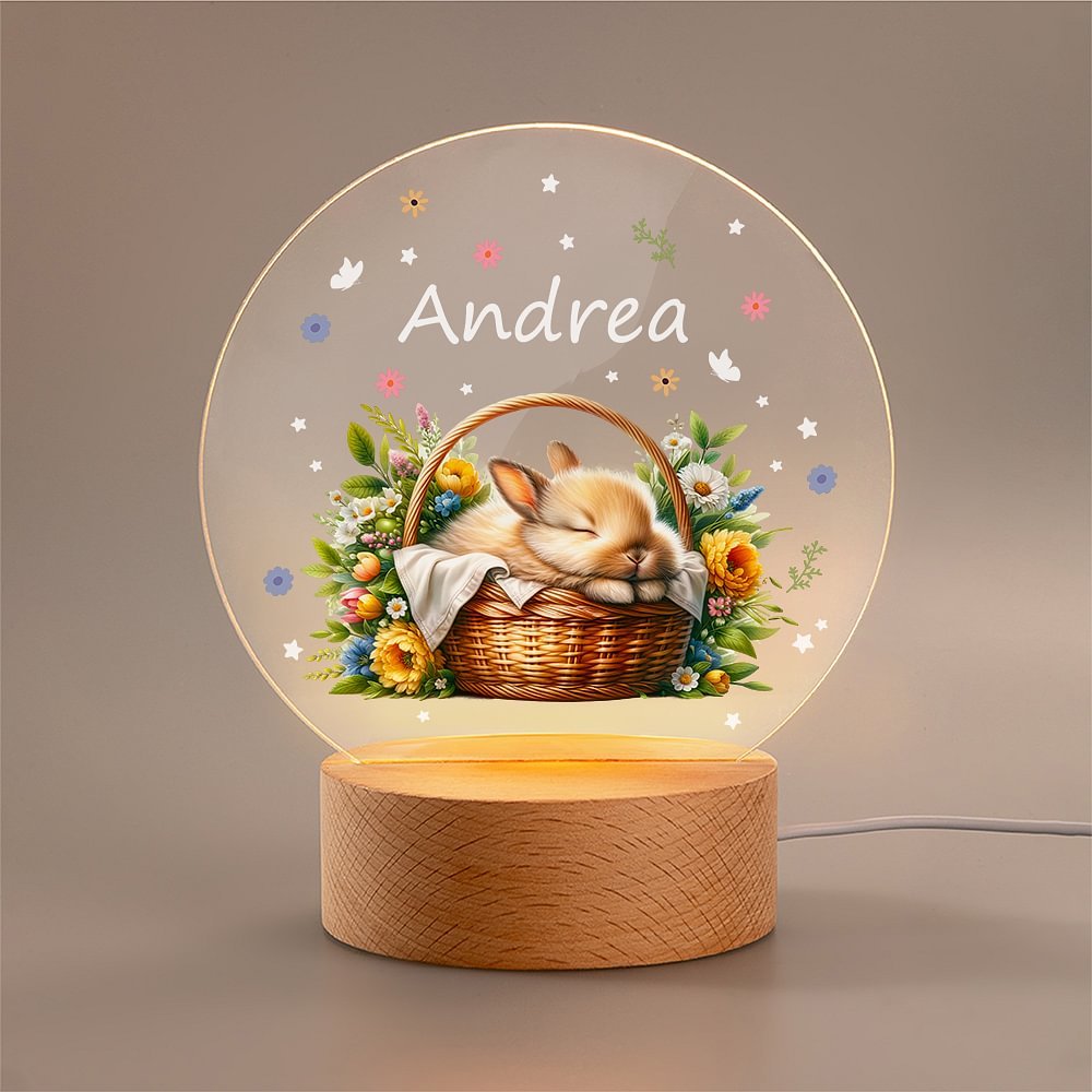 Notre veilleuse représente un lapin endormi dans un panier, vous pouvez la personnaliser avec le nom de votre enfant, ce qui est enfantin et mignon. Créez une veilleuse unique en son genre pour créer une atmosphère de vacances chaleureuse et rêveuse pour vos enfants.