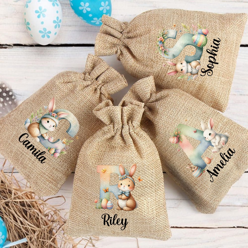 Ce sac peut être personnalisé avec une initiale, chaque initiale ayant une image unique de lapin de Pâques en aquarelle et des décorations telles que des fleurs, des œufs, etc. qui ajoutent à l'atmosphère joyeuse de Pâques. Vous pouvez également personnaliser les noms de vos enfants sur les sacs pour les rendre encore plus exclusifs.