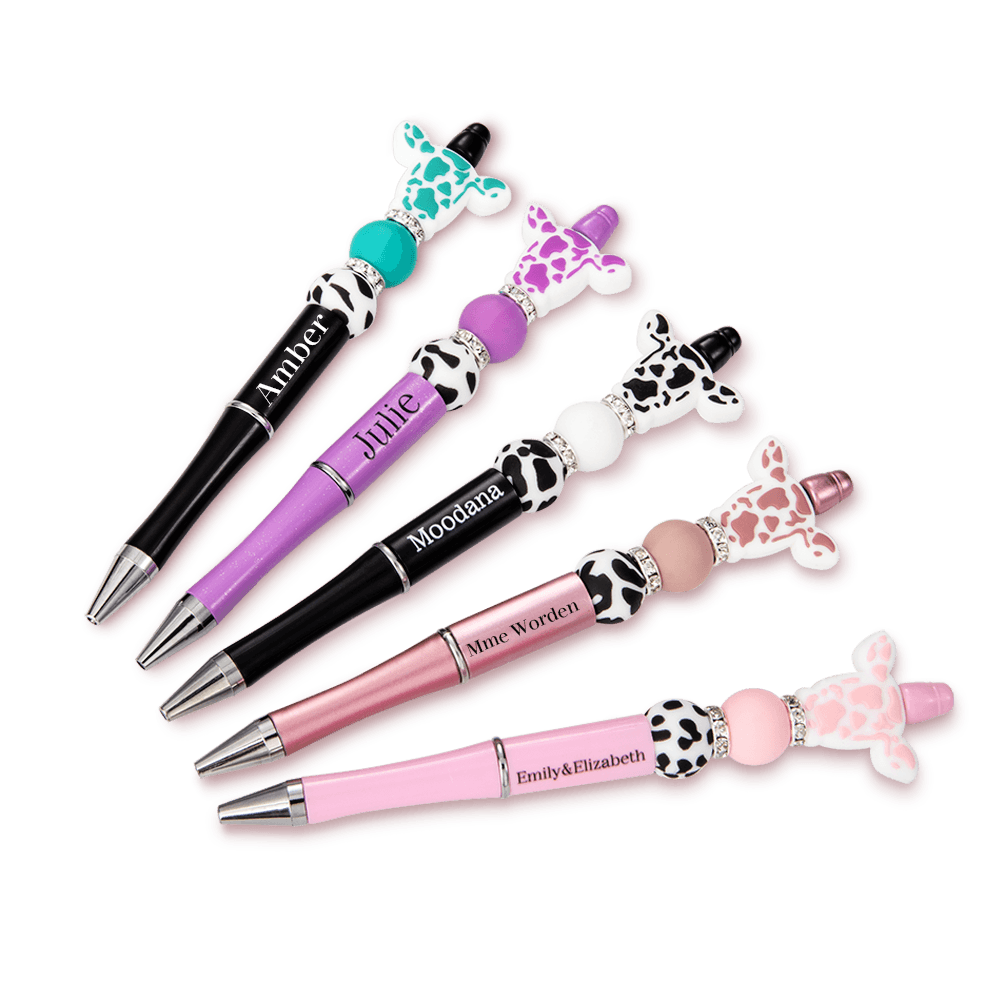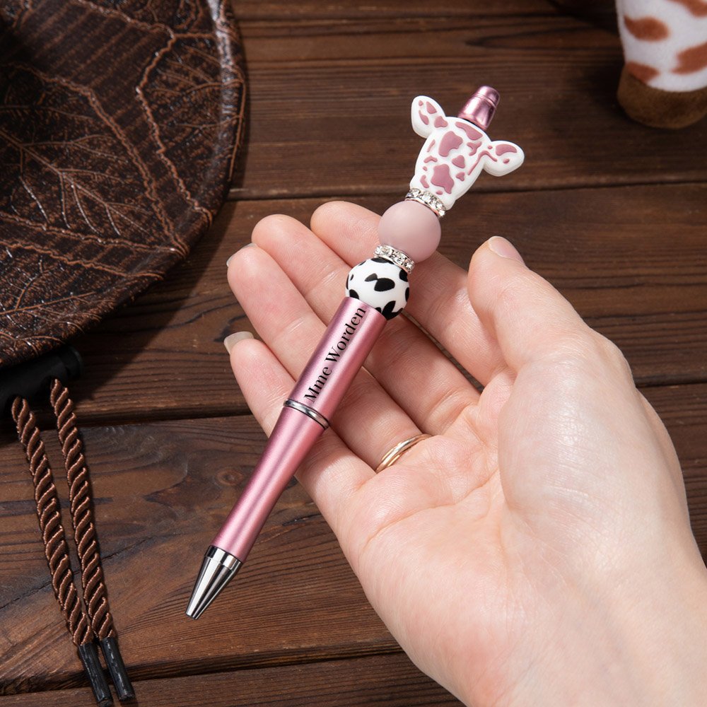 Démarquez-vous des stylos traditionnels avec ce stylo personnalisé en perles, doté de charmantes perles en forme de tête de vache et d'un motif de vache occidental. Le corps du stylo peut être personnalisé avec du texte, ajoutant une touche personnelle à votre instrument d'écriture.