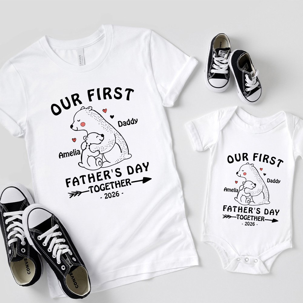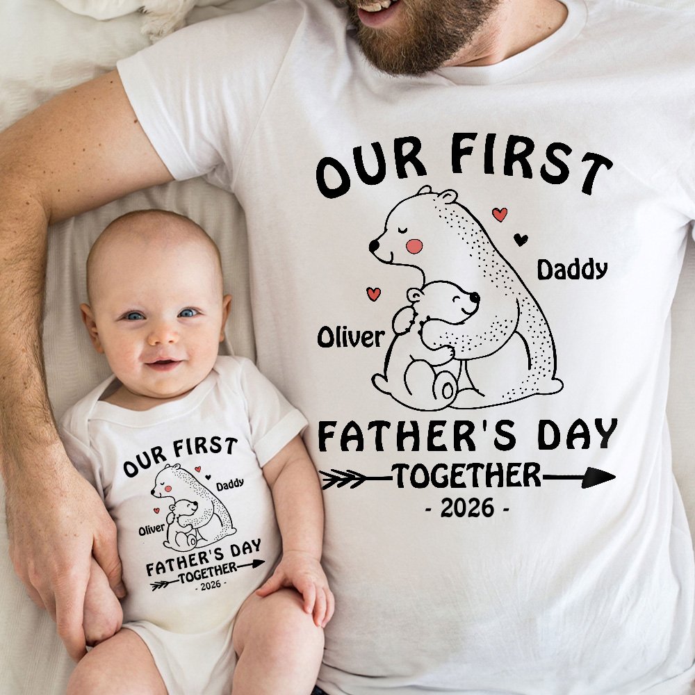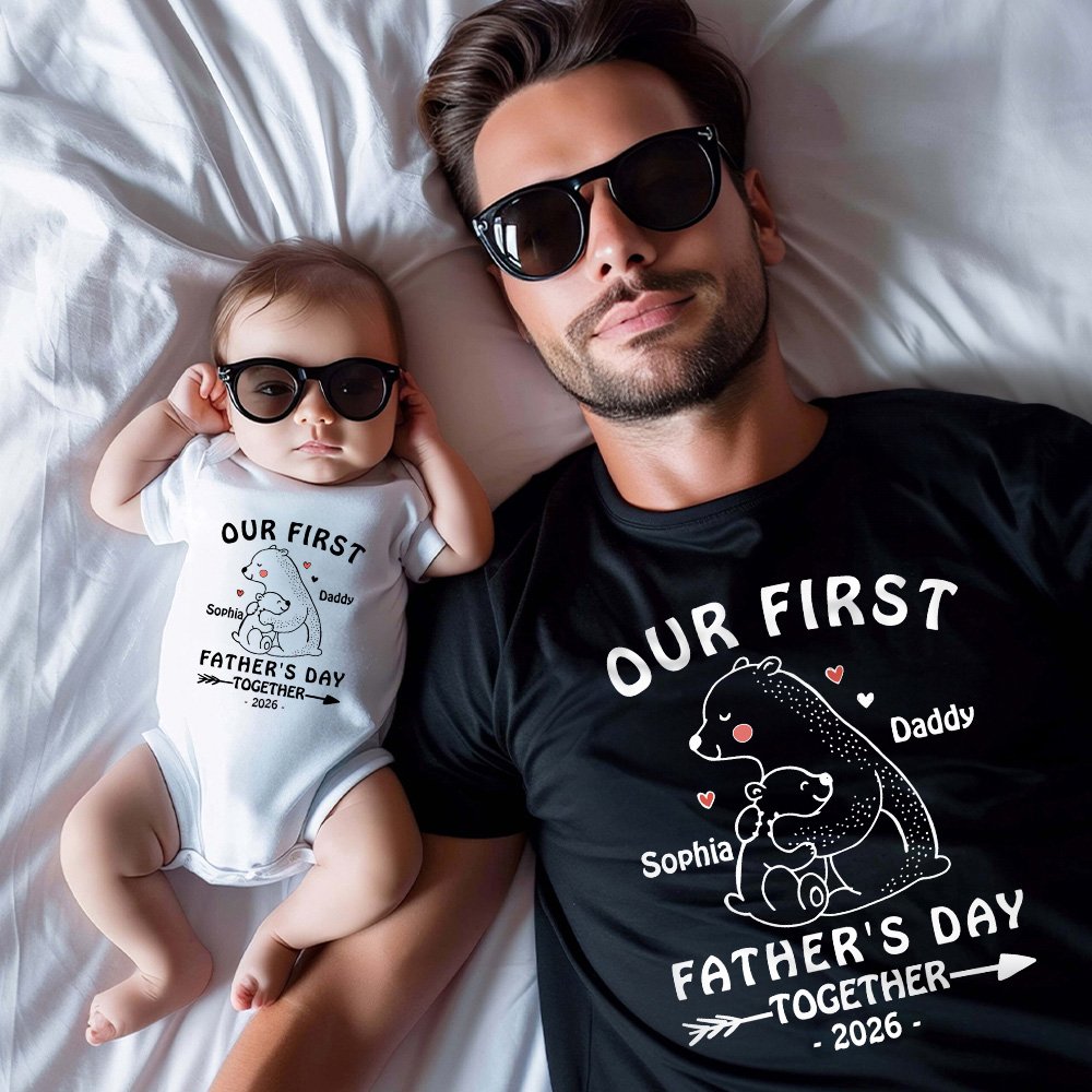 Nos vêtements sont conçus autour d'un adorable ourson parent-enfant. Le bébé ours est blotti dans les bras de son père, et l'image est magnifiquement chaleureuse, comme une façon d'exprimer l'amour entre le père et l'enfant, et avec le texte de célébration de "Notre première fête des pères", qui rend l'atmosphère festive plus solide et plus chaleureuse. Nous offrons la possibilité d'ajouter votre nom et celui de votre enfant sur le devant du vêtement, ce qui ajoute une touche personnalisée et rend le vêtement plus significatif.