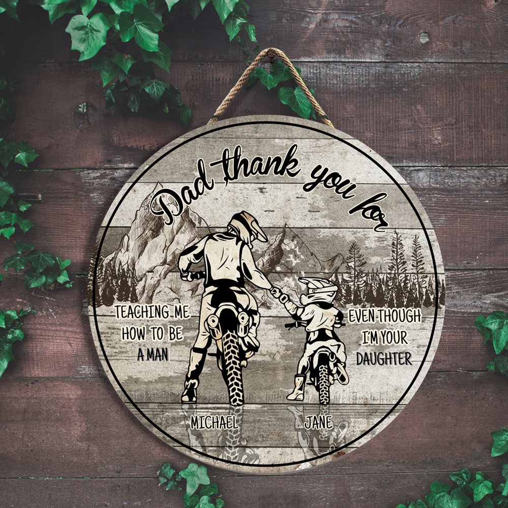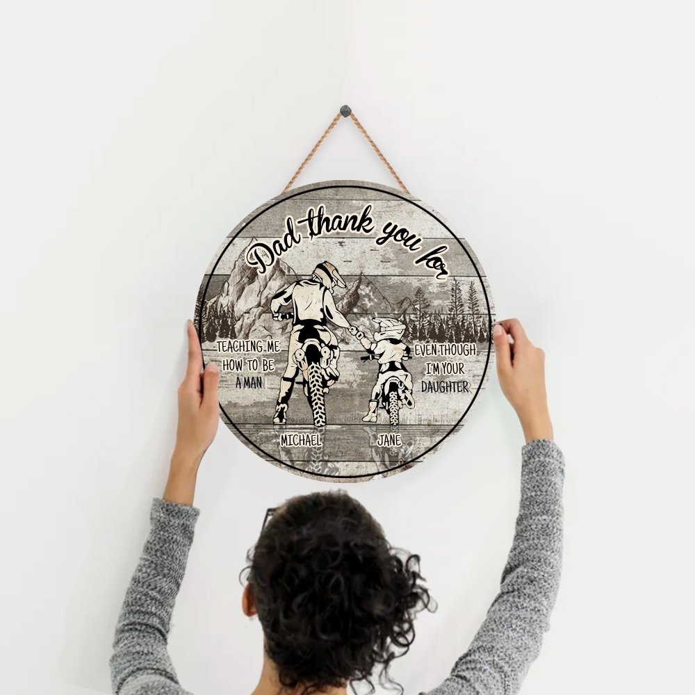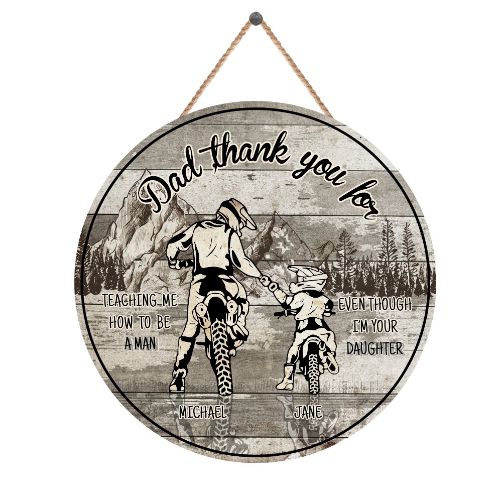 Notre panneau de décoration pour papa imprime le père et la fille chevauchant des motos ensemble et avec la phrase "Papa, merci de m'avoir appris comment être un homme, même si je suis ta fille". C'est un cadeau parfait de la fille pour la fête des pères.