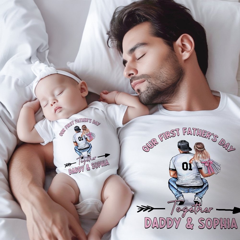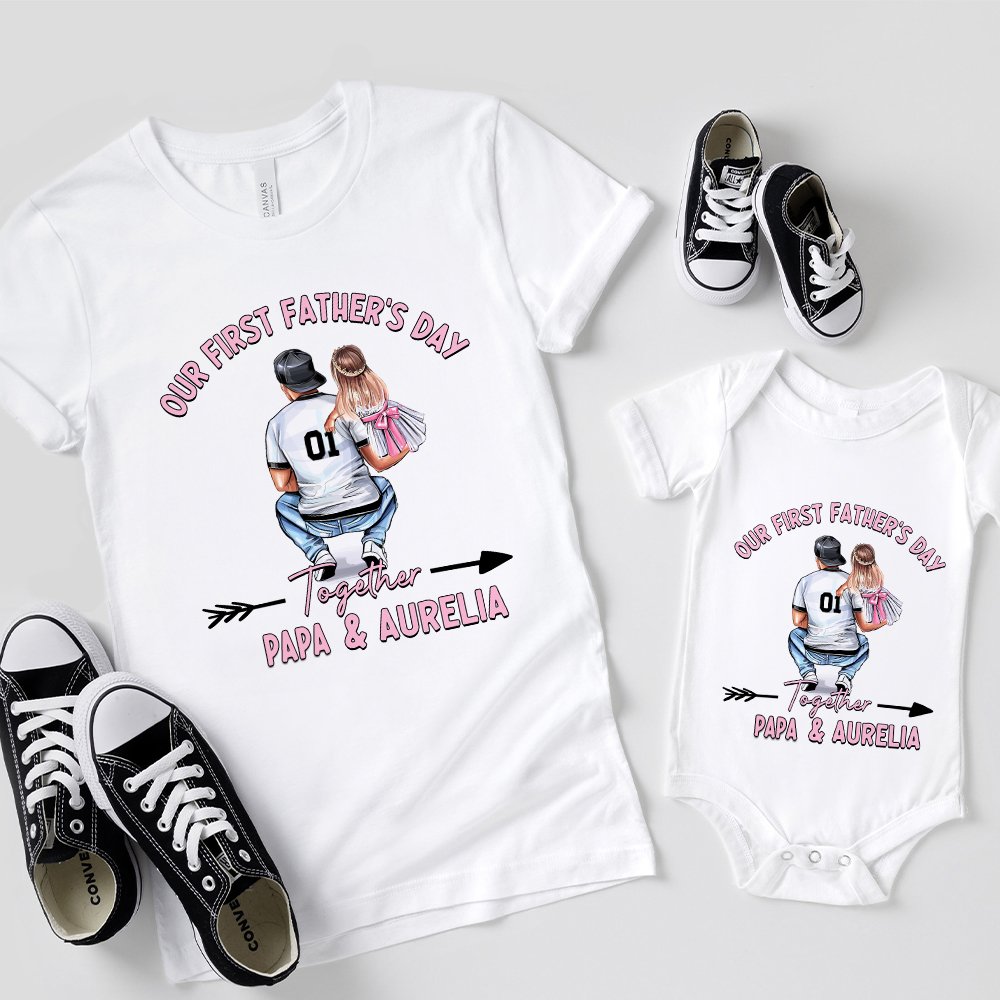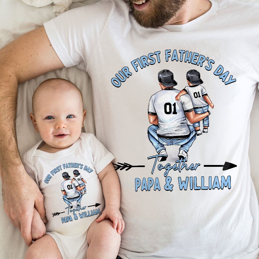 Cet ensemble bébé-père est imprimé avec les mots chaleureux "Notre première fête des pères ensemble", symbolisant la relation inséparable entre le père et le bébé et montrant les moments chaleureux entre parents et enfants. Le vêtement est magnifiquement représenté par l'image d'un père tenant son enfant dans ses mains. Il symbolise le lien indéfectible et la joie d'être père.