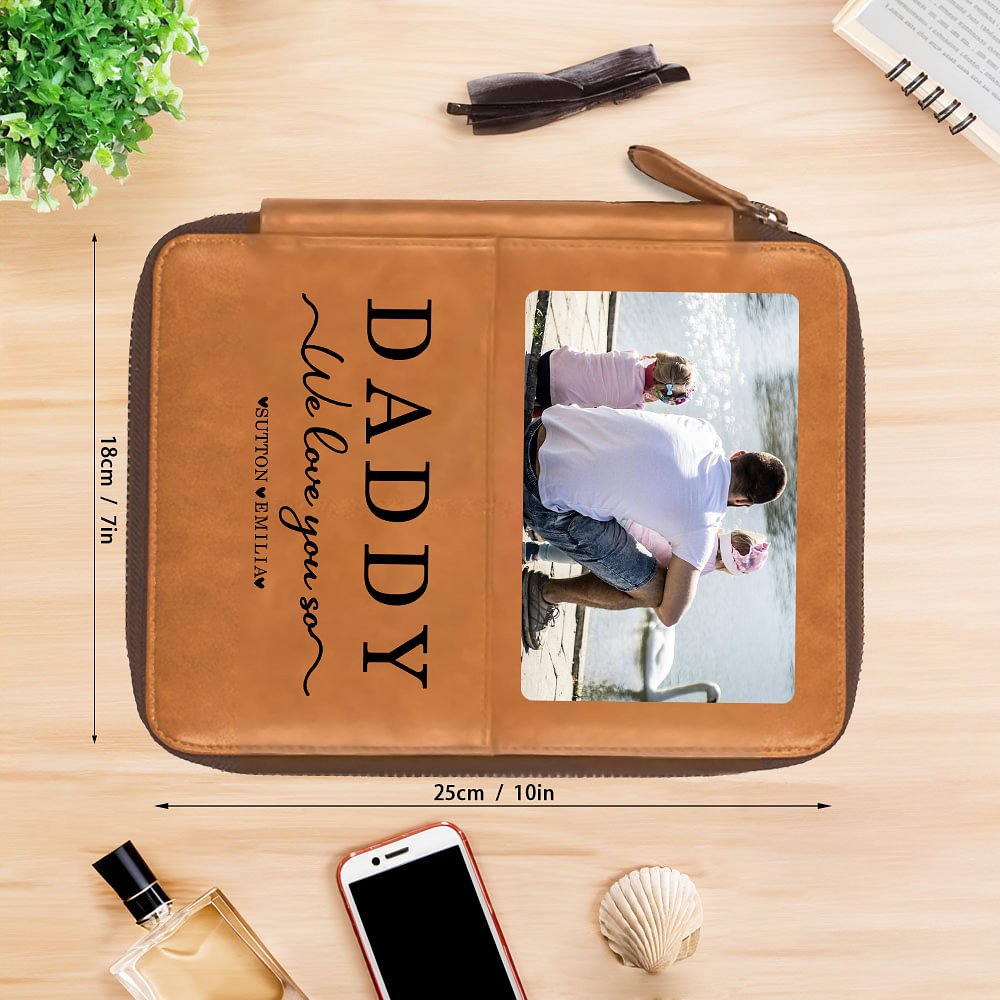 Ce portefeuille de passeport en cuir se distingue par la possibilité d'y ajouter une photo chère et de le personnaliser avec les noms de 1 à 5 enfants, créant ainsi un souvenir vraiment unique et significatif pour papa ou grand-père.