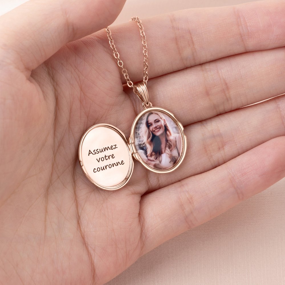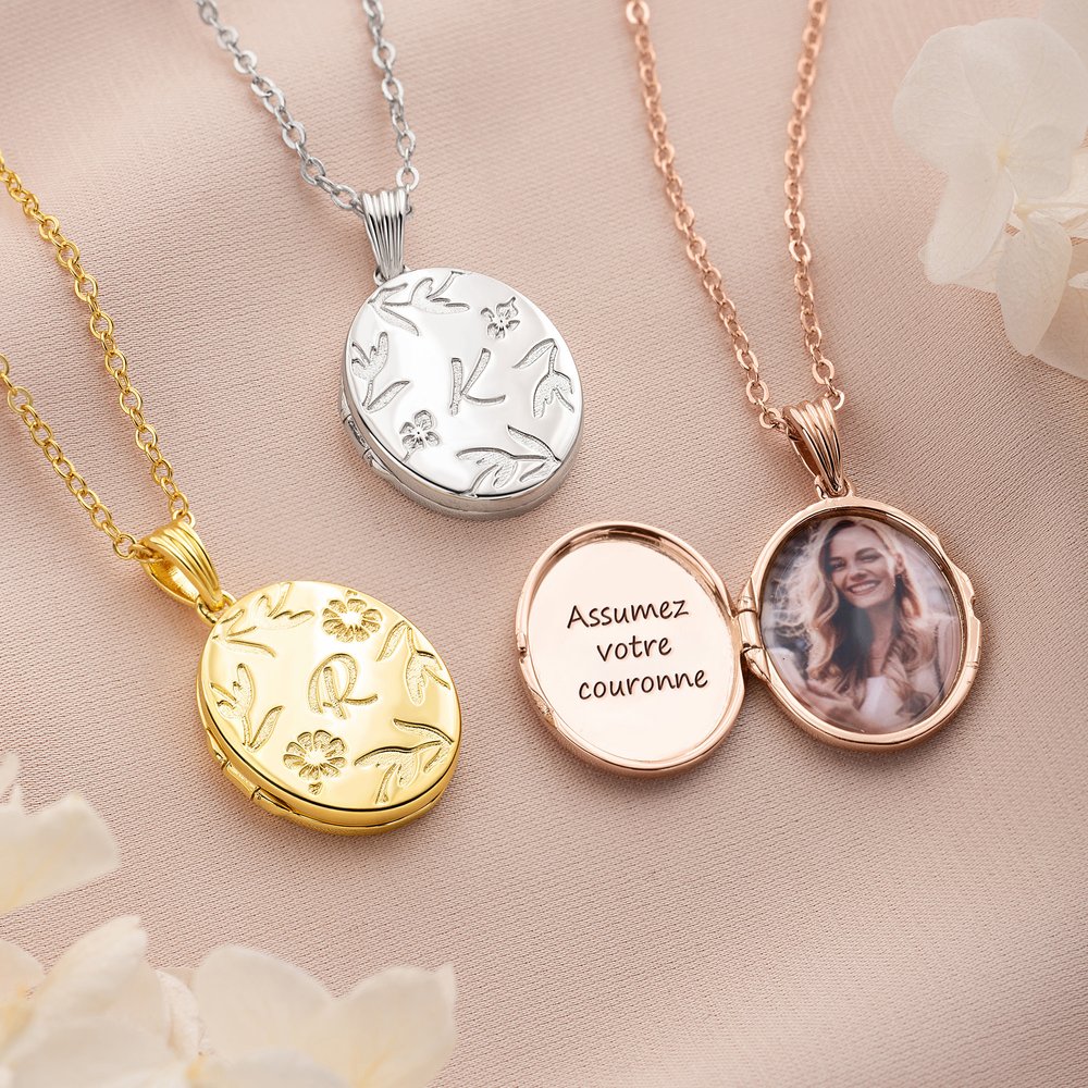 Ce collier exquis mêle astucieusement de multiples significations personnelles dans un bijou élégant. Le pendentif représente une fleur de naissance correspondant au mois de naissance de la personne qui le porte, chaque fleur ayant une signification symbolique unique. L'initiale personnalisable est subtilement intégrée au motif floral. Le pendentif ovale classique dégage un charme vintage, tandis que l'inclusion d'une ou deux photos transforme le collier en une boîte à souvenirs portable. Un court message, une date ou un nom peuvent également être gravés à l'intérieur du pendentif.