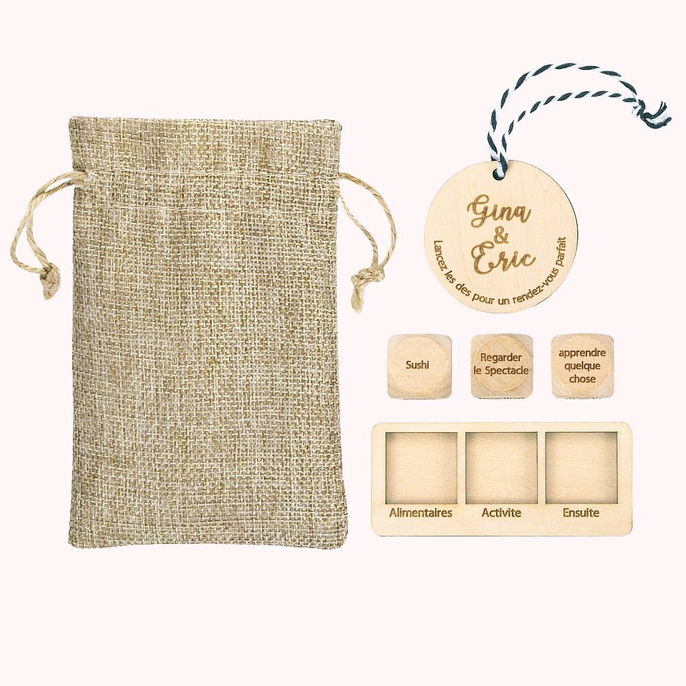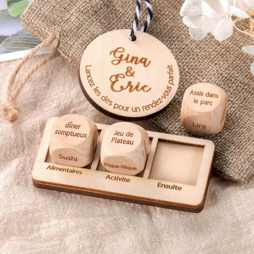 •Facile à ranger et à transporter. Tout ce que vous voulez faire, c'est faire défiler les dés et profiter de votre temps. Gravure sur le disque en bois rond avec un souvenir parfait de votre vie. Gardez tout le souvenir heureux pour la vie. Gravure sur dés par défaut : Nourriture : mon choix, votre choix, pizza, hamburgers, chic schmancy, faire le dîner ensemble. Activité : aller au cinéma, rester au cinéma, soirée de jeux, bowling, musée, voir un spectacle en direct. Après : cocktails, câlins à la maison, café, dessert, aller en boîte, aller se promener."