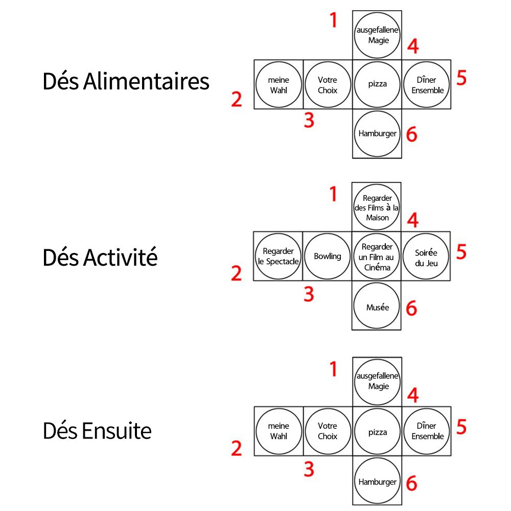"•Résoudre la vieille question : « Que voulez vous faire ce soir? » Vérifiez ces dés. Ce petit jeu vous aidant à résoudre ces difficultés. Trois dés au choix en cas de différentes occasions et aux différentes étapes de votre relation. Une façon amusante de décider quoi faire ensuite.