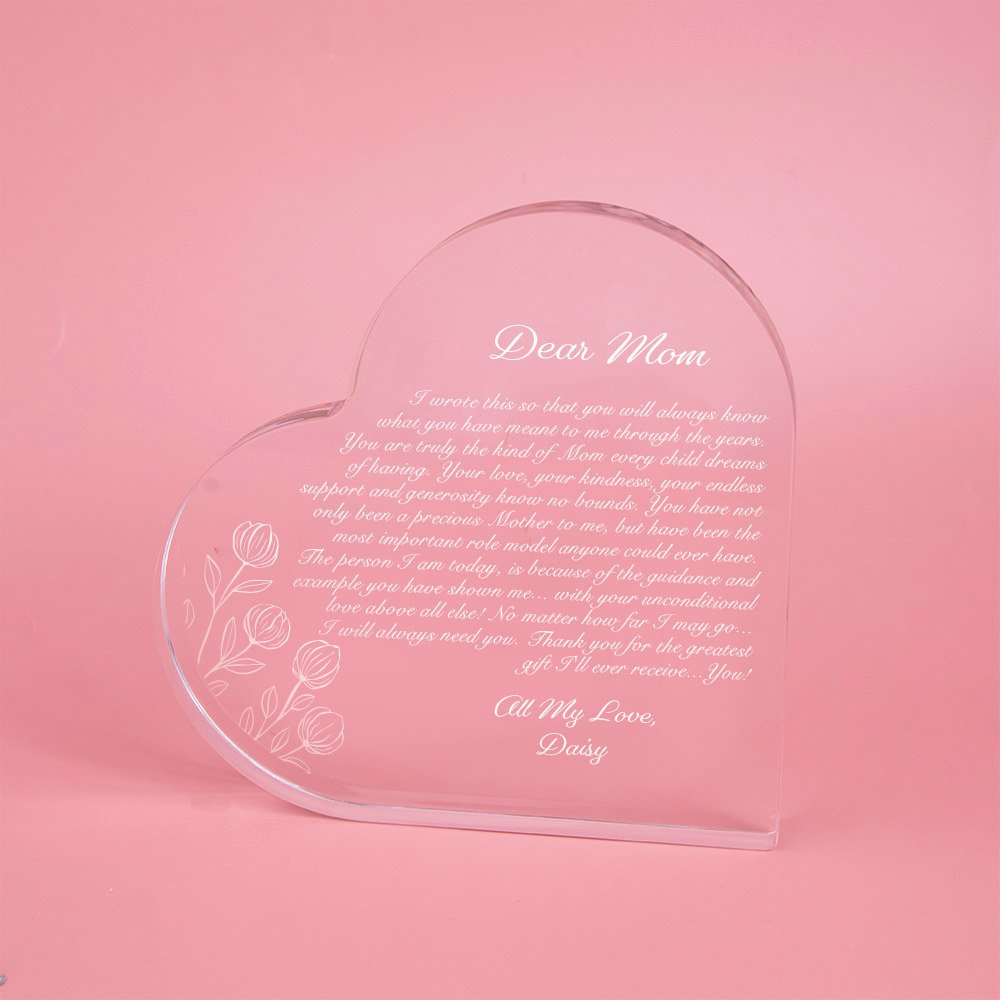 Maman a toujours une place spéciale dans nos cœurs, et on ne peut jamais lui dire assez à quel point elle compte pour vous. La plaque en forme de cœur peut être personnalisée avec des mots chaleureux et touchants pour votre maman, exprimant votre amour pour créer un cadeau vraiment unique.