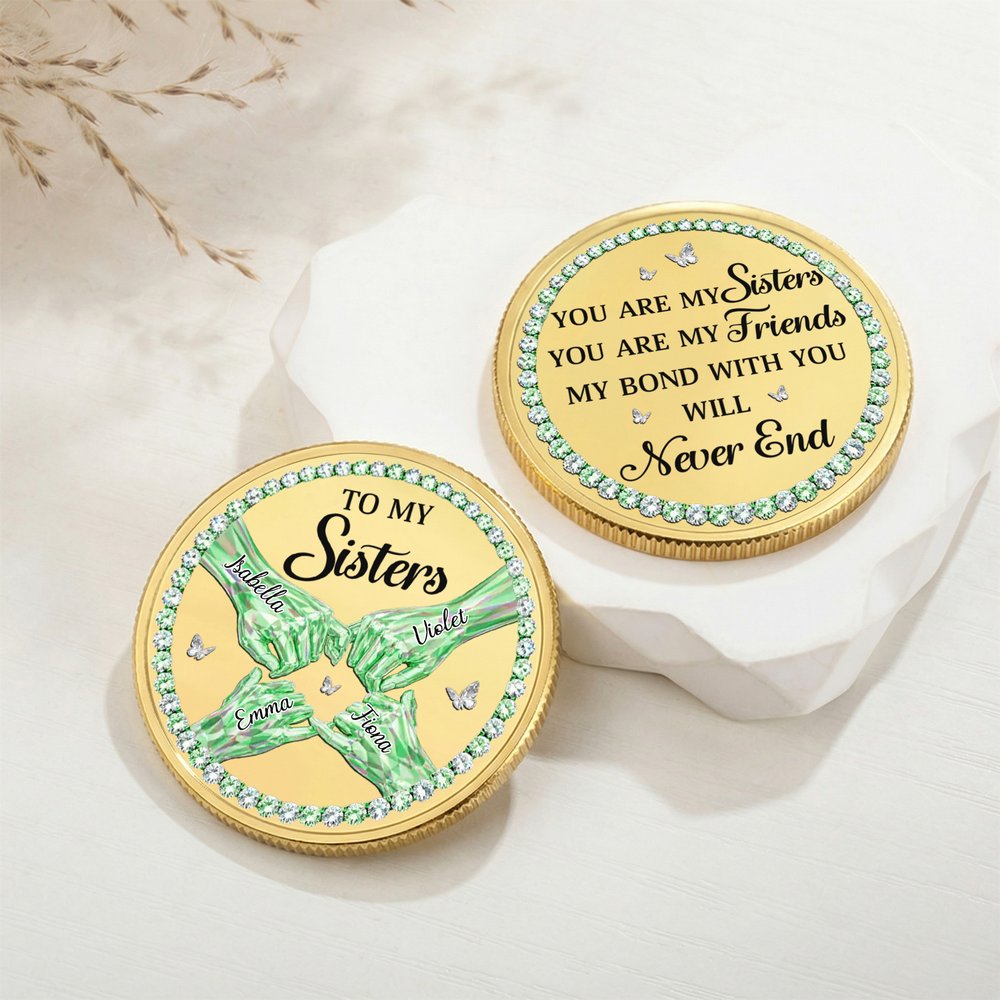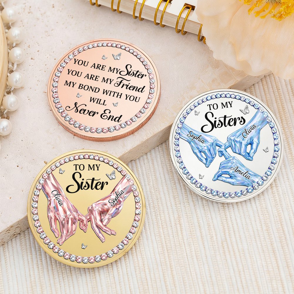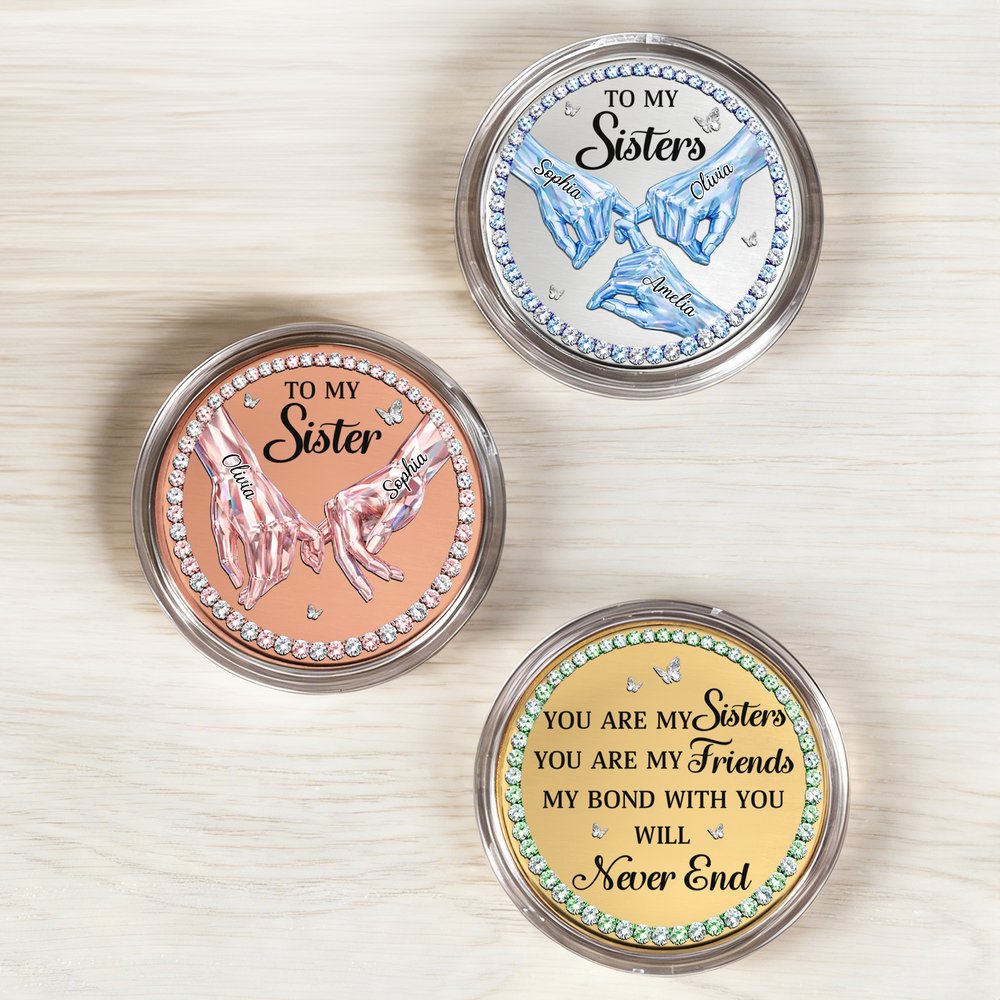 Cette pièce commémorative au cœur tendre offre un style entièrement personnalisé pour célébrer le lien unique qui unit les sœurs ou les meilleures amies. Vous pouvez personnaliser le nombre de mains sur le motif en fonction de votre groupe de sœurs, ajouter le nom de chaque personne dans une écriture élégante et choisir votre couleur de base préférée ainsi qu'une bordure en pierres précieuses pour créer un souvenir unique en son genre.