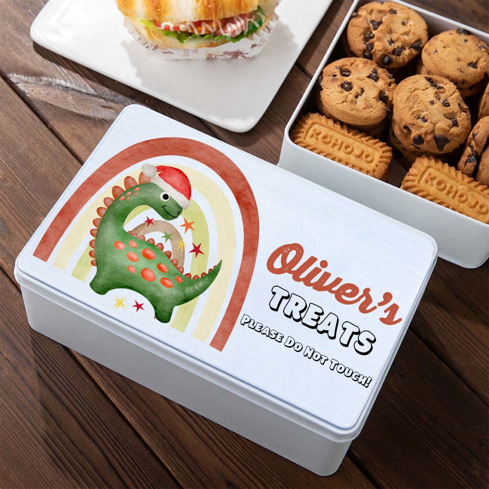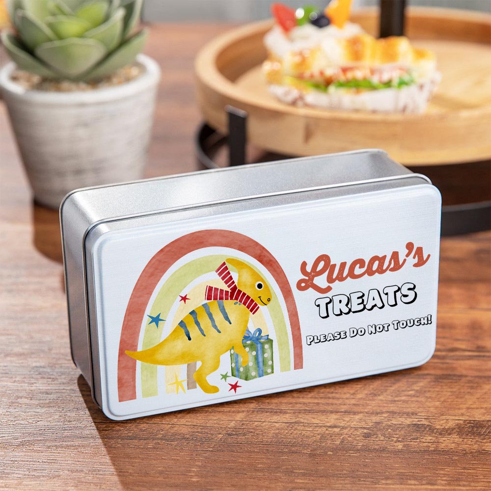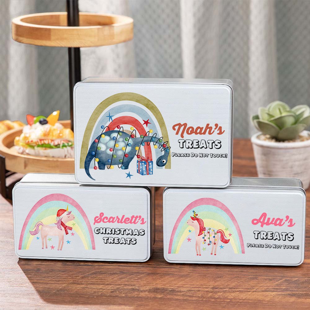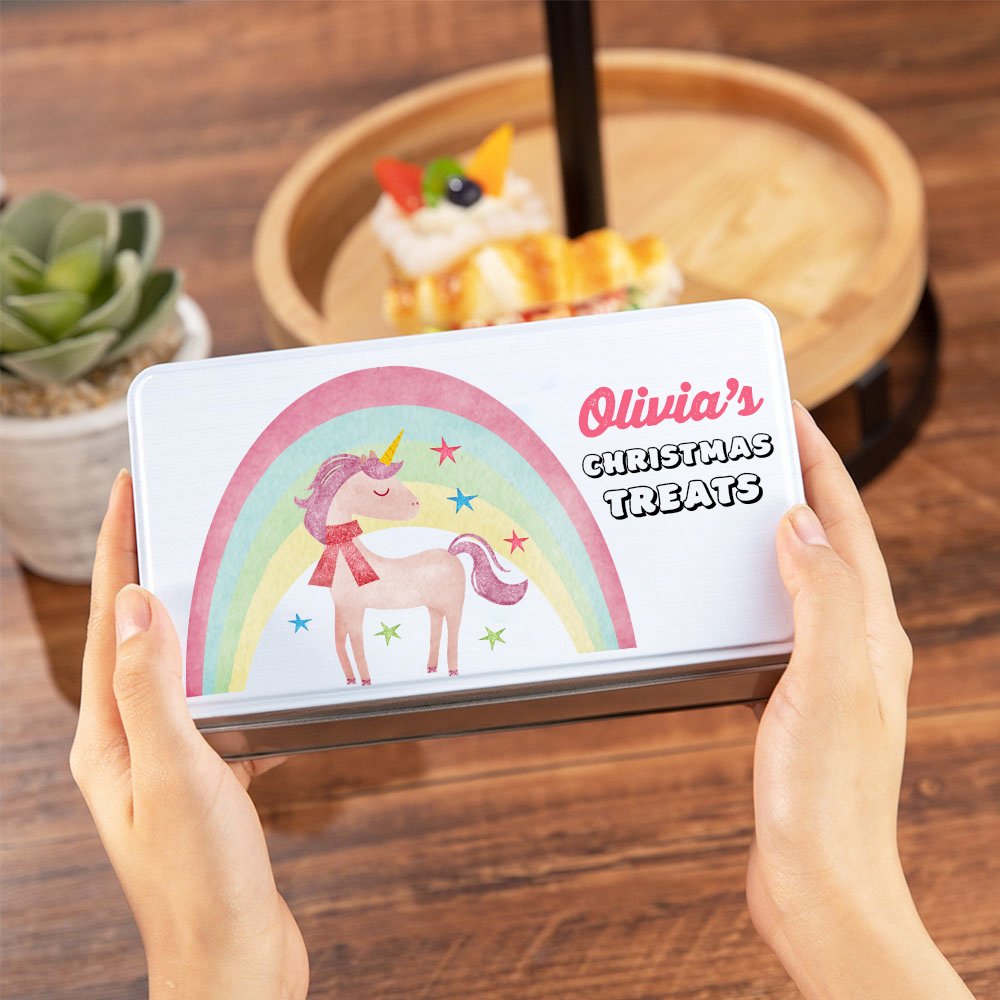 La boîte en métal est ornée d'un motif fantaisiste et unique représentant une licorne, un dinosaure, un arc-en-ciel et un motif coloré avec des détails intimes.