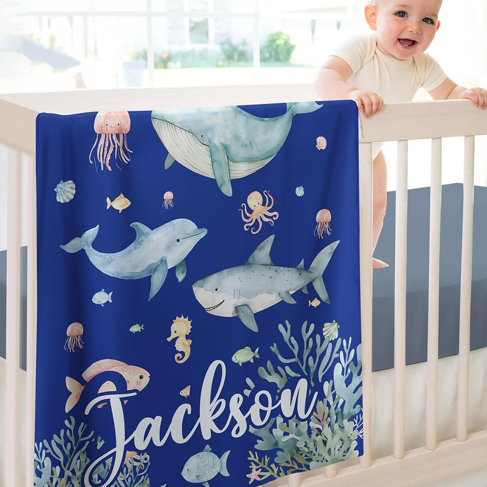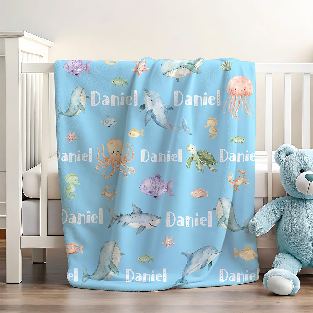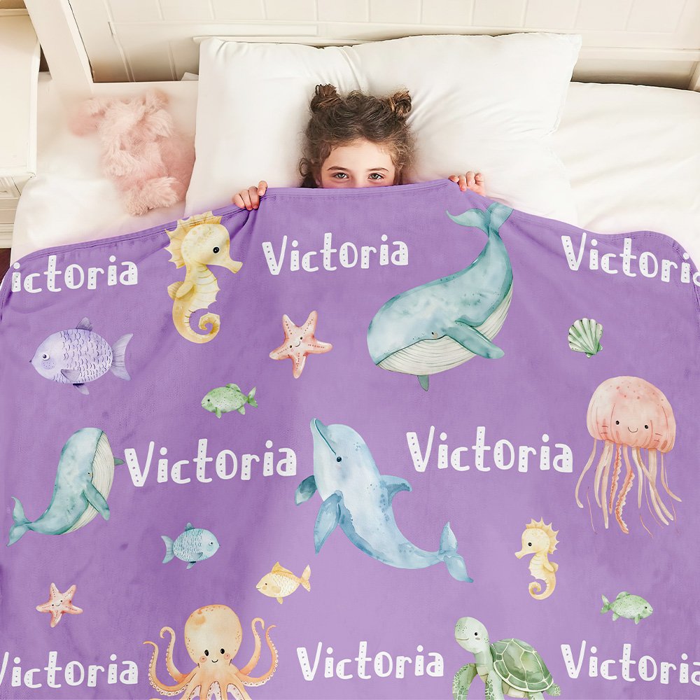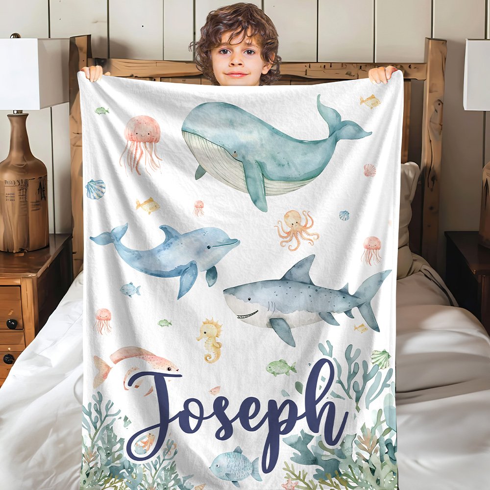 Couverture Douce Personnalisée avec Nom et Motif d'Animaux Marins Cadeau Anniversaire Noël pour Enfants