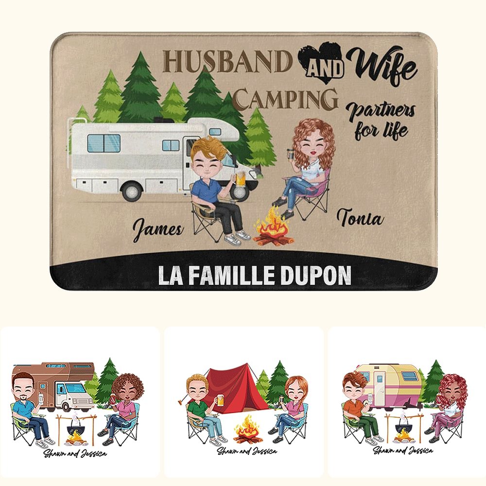 Capturez l'essence du camping avec notre paillasson au design unique qui combine des éléments de forêt et de feu de camp. Ce paillasson se distingue par la possibilité de le personnaliser avec les noms du couple et de la famille, accompagnés de la citation "Mari et femme, partenaires de camping pour la vie". Cette personnalisation ajoute une touche sentimentale, ce qui en fait un cadeau extraordinaire ou un souvenir précieux pour vous et votre partenaire.