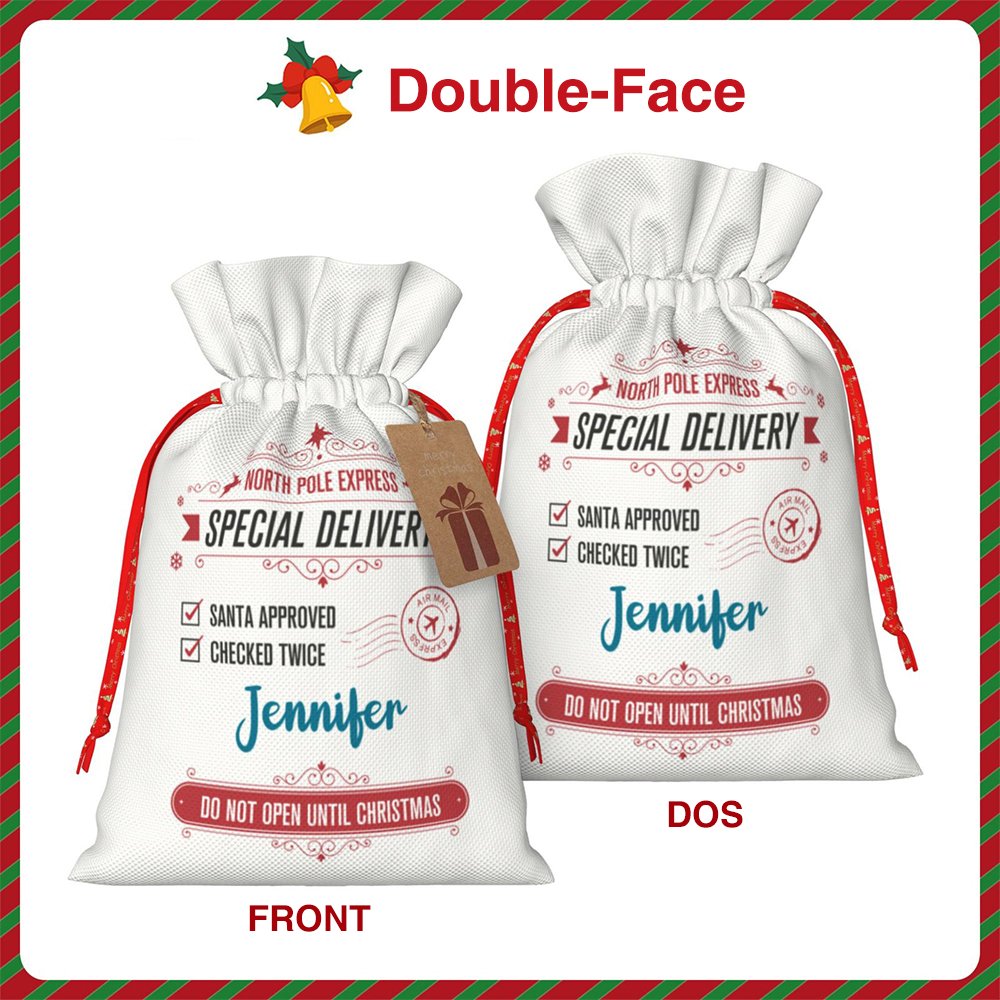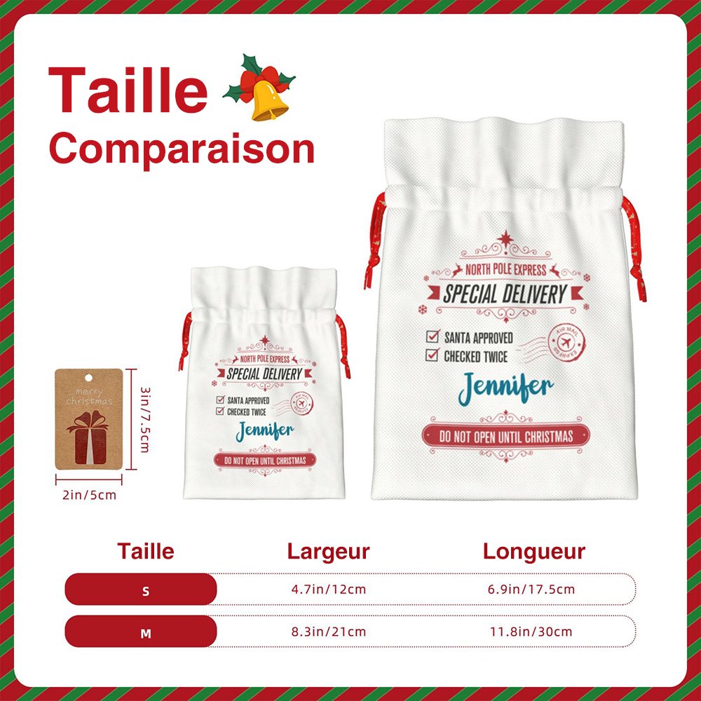 Ce sac à cordon de Noël peut être personnalisé avec le nom du destinataire, envoyez cette livraison spéciale de Noël à votre enfant ! Le sac à cordon sera le cadeau idéal pour les enfants et la famille, il apportera des éléments plus intéressants à votre Noël, et rendra votre Noël inoubliable !