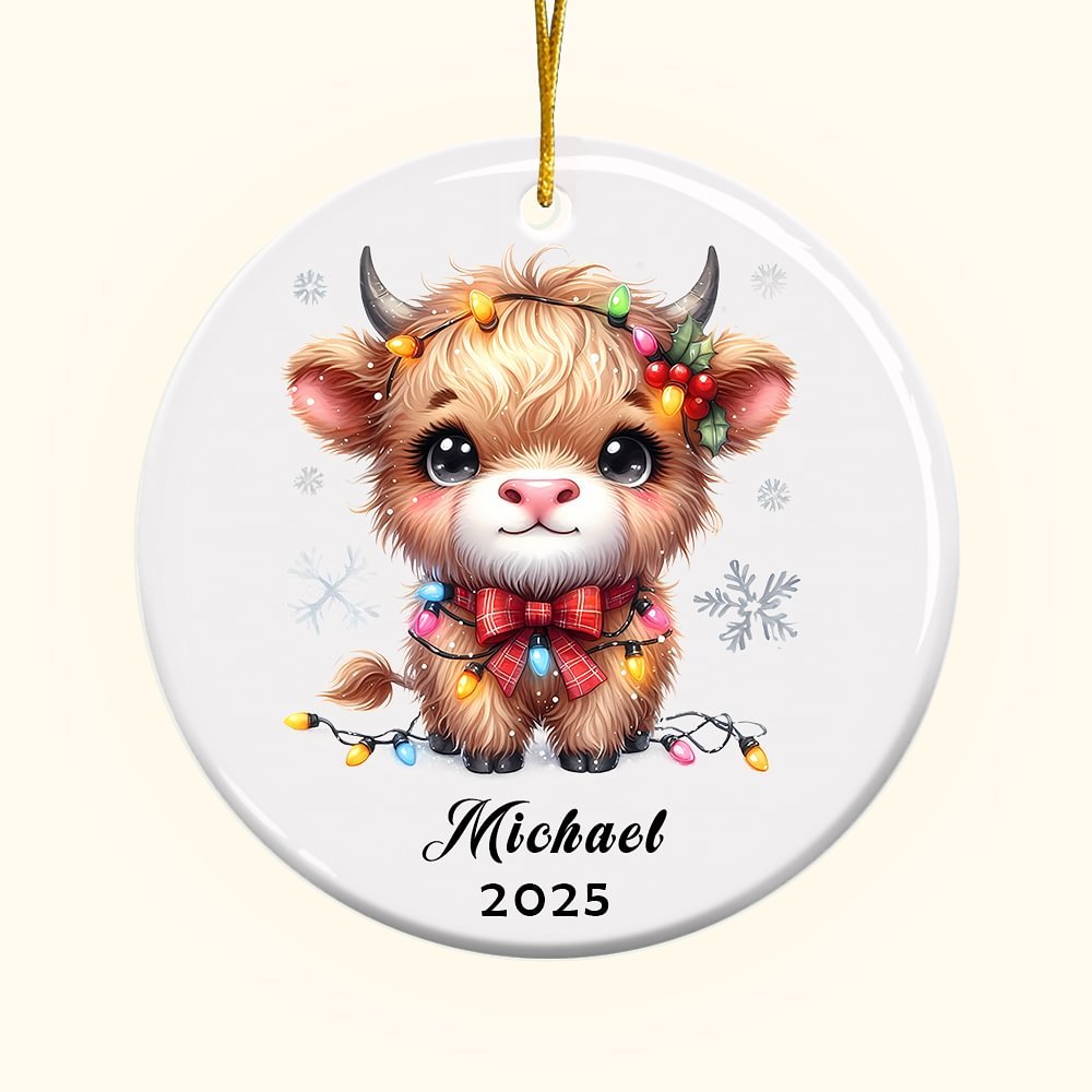 Cette décoration sur le thème de Noël est recto-verso et personnalisable, avec une adorable vache Highland sur le devant, portant un chapeau et un nœud de Noël, des lumières colorées autour de son corps, et une photo personnalisée au dos, créant ainsi une atmosphère de fête intense. Nous vous permettons également d'ajouter votre nom et l'année, faisant de cet ornement un précieux souvenir.