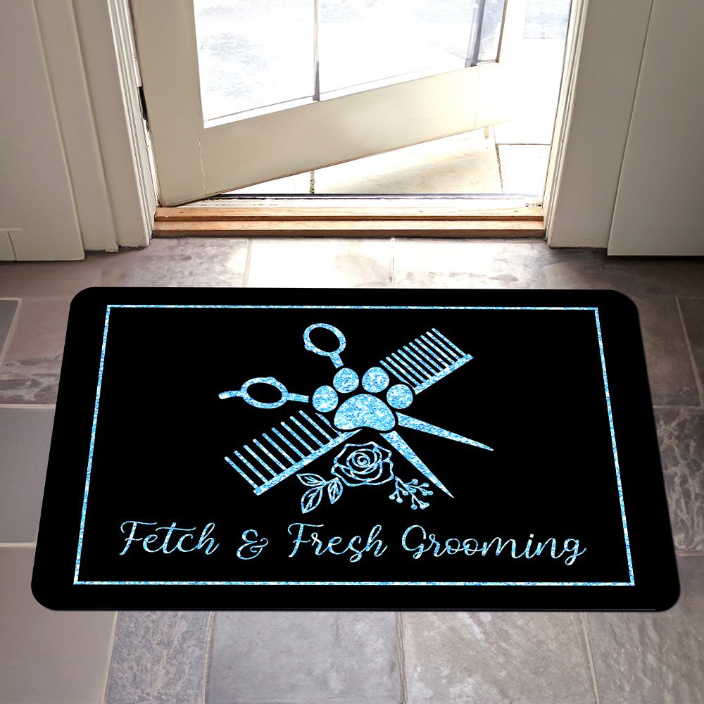 Ce paillasson met joliment en valeur votre amour pour les soins aux animaux en présentant un charmant mélange d'éléments de toilettage tels que des empreintes de pattes, des ciseaux, des peignes, des flacons pulvérisateurs et des séchoirs à cheveux. Il est amusant d'accueillir les clients et les amoureux des animaux dans votre espace.