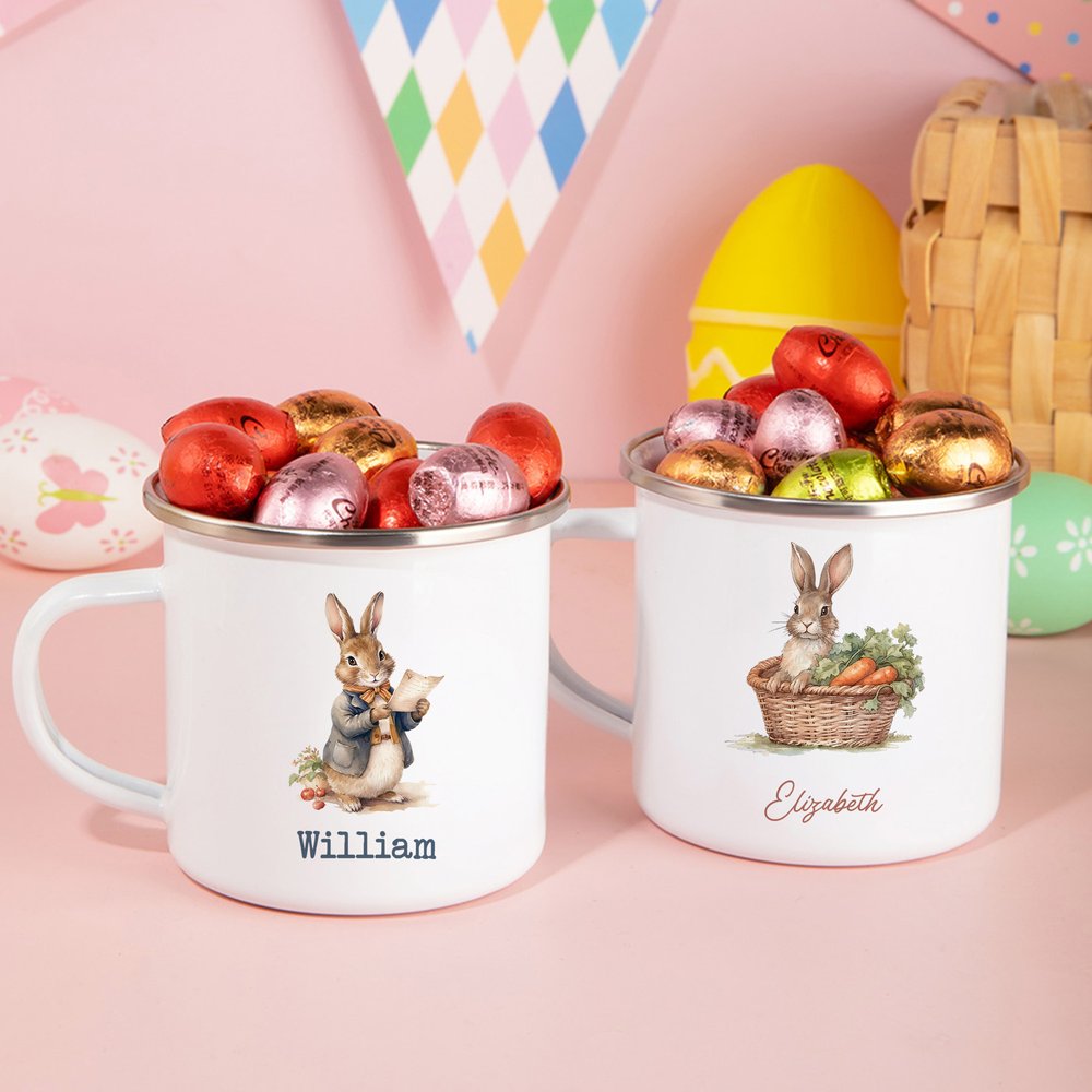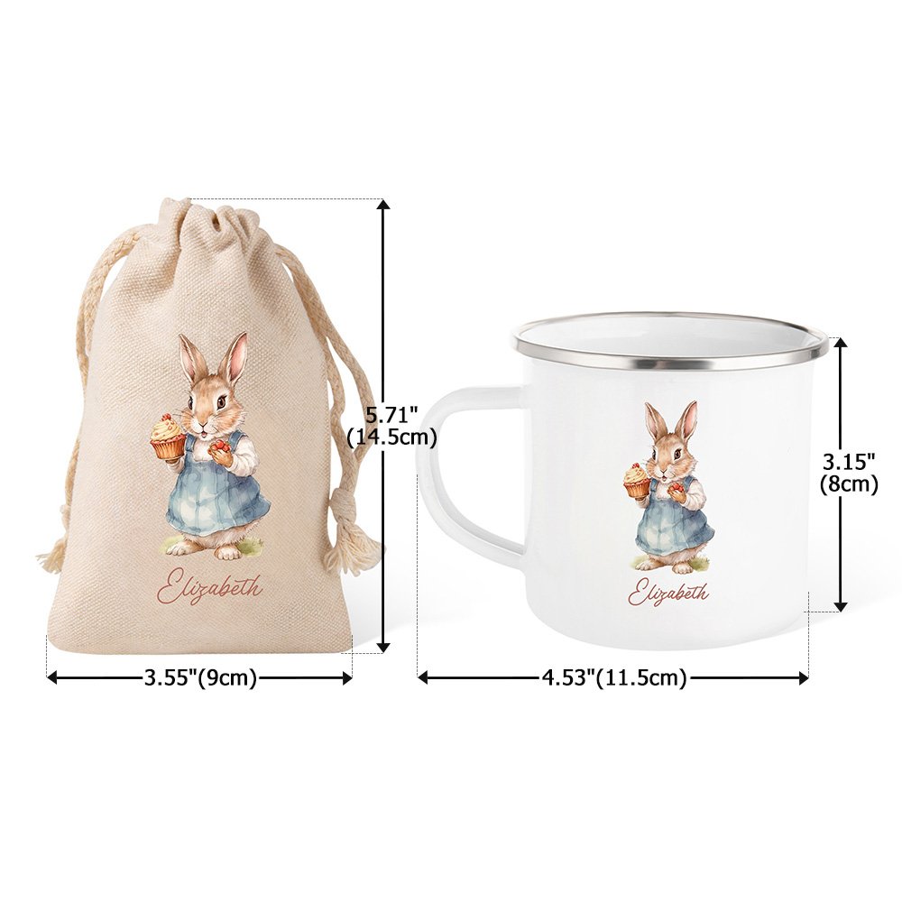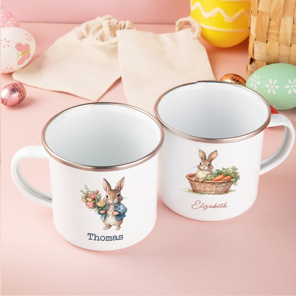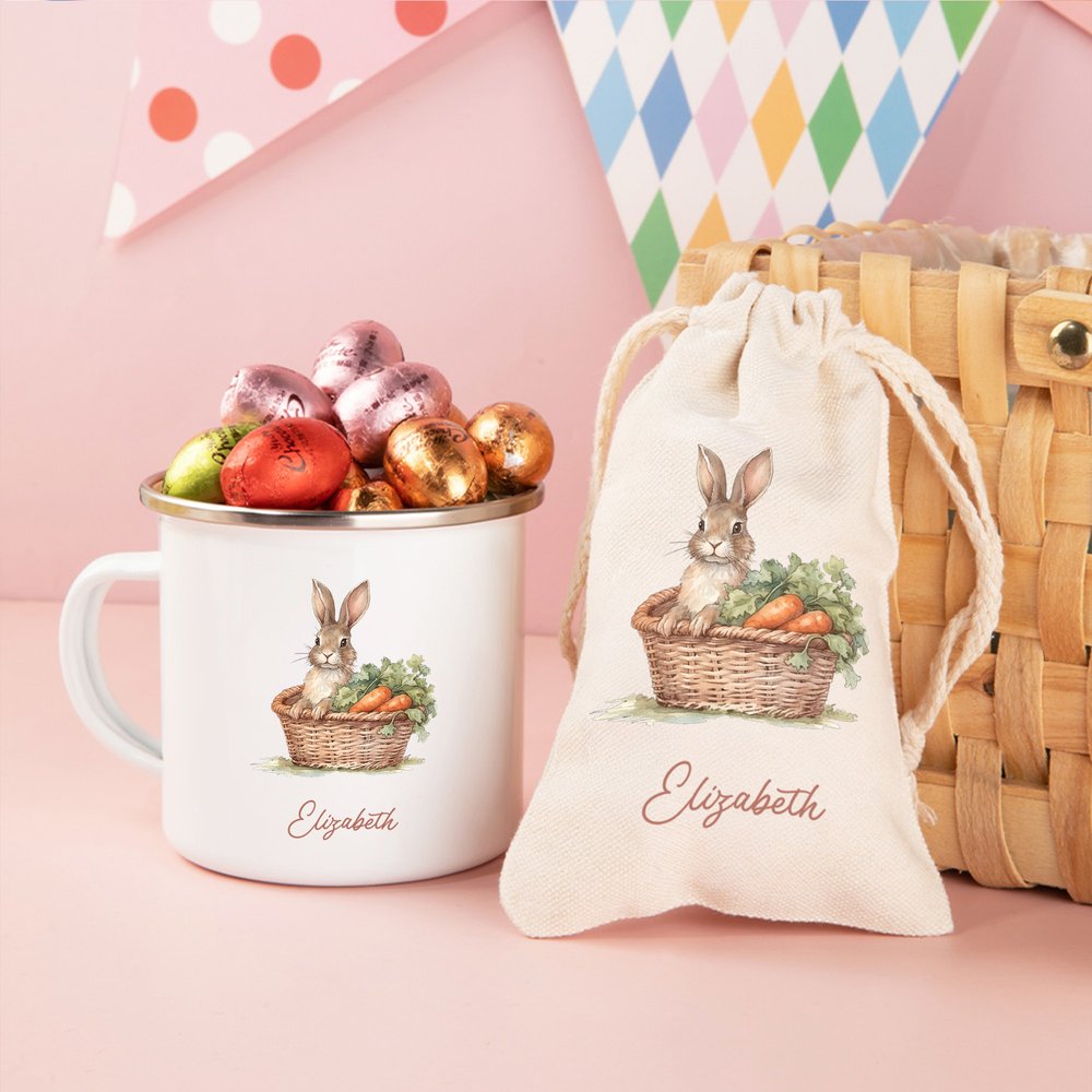 Paré d'adorables motifs de lapin de Pâques, cet ensemble comprend une tasse en émail et un sac à goûter assorti, tous deux débordant d'énergie printanière et d'un charme ludique. Personnalisez le mug et le sac avec le nom de l'enfant pour faire de chaque pièce une exclusivité de vacances qui ajoute un sens particulier du rituel à la célébration de Pâques de votre enfant.