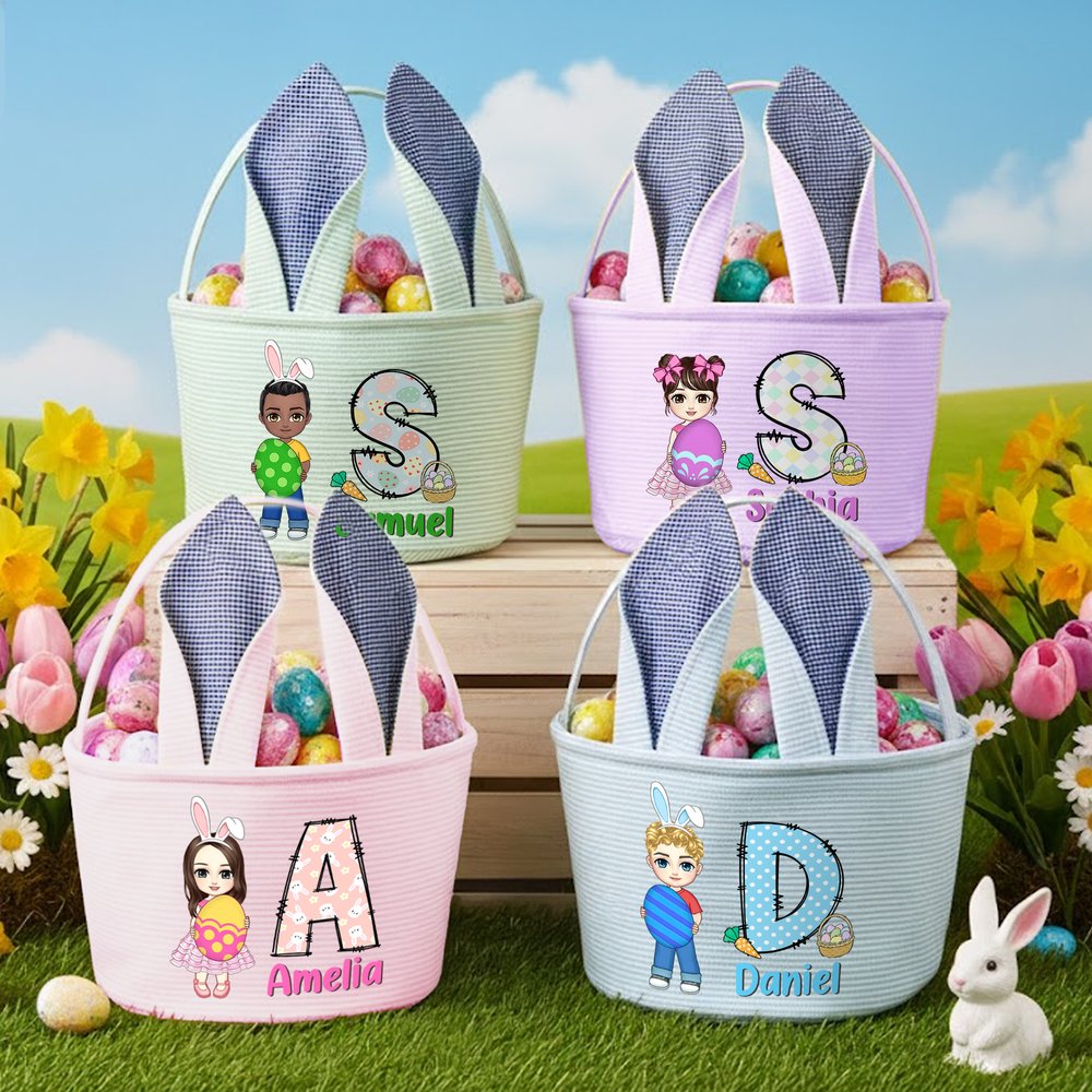 En utilisant d'adorables personnages de dessins animés comme élément central, associés à des œufs de Pâques, les noms et les initiales sont conçus dans un style ludique et vivant, ciblant précisément les préférences des enfants. Le panier n'est donc pas seulement un contenant de rangement, mais aussi un accessoire attrayant pour la chasse aux œufs de Pâques, dans une ambiance festive.