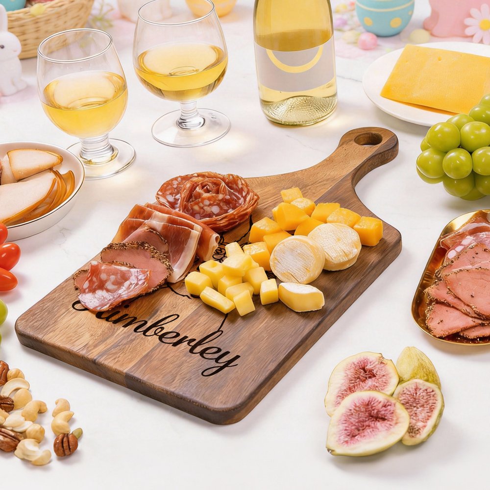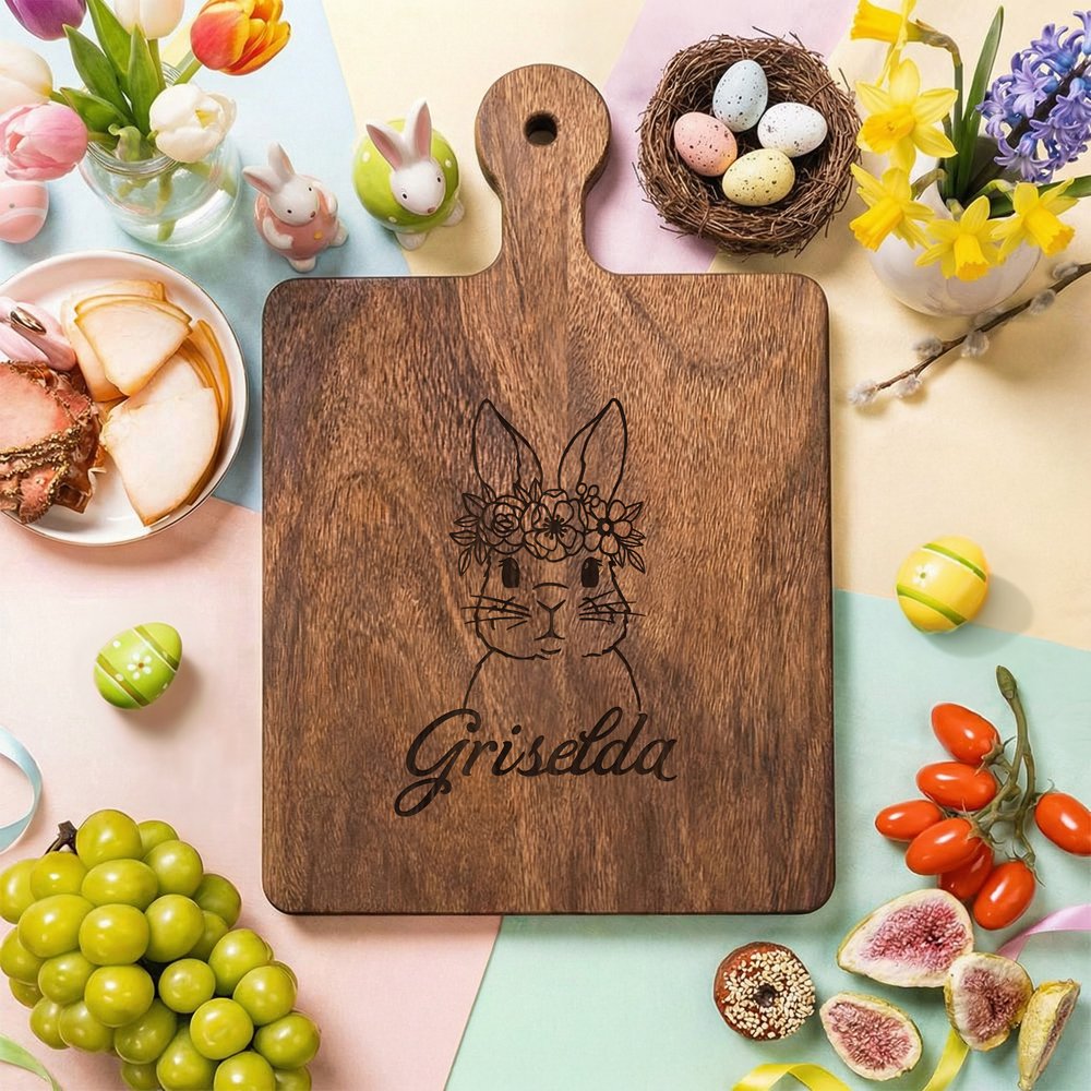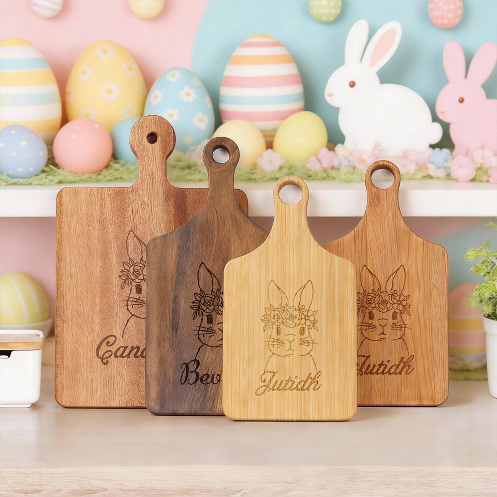 Inspirée par l'ambiance festive de Pâques, cette planche à découper est dotée d'une poignée ergonomique et permet la gravure de noms personnalisés. Les nœuds naturels du bois et les variations uniques du grain font de chaque pièce un objet unique.