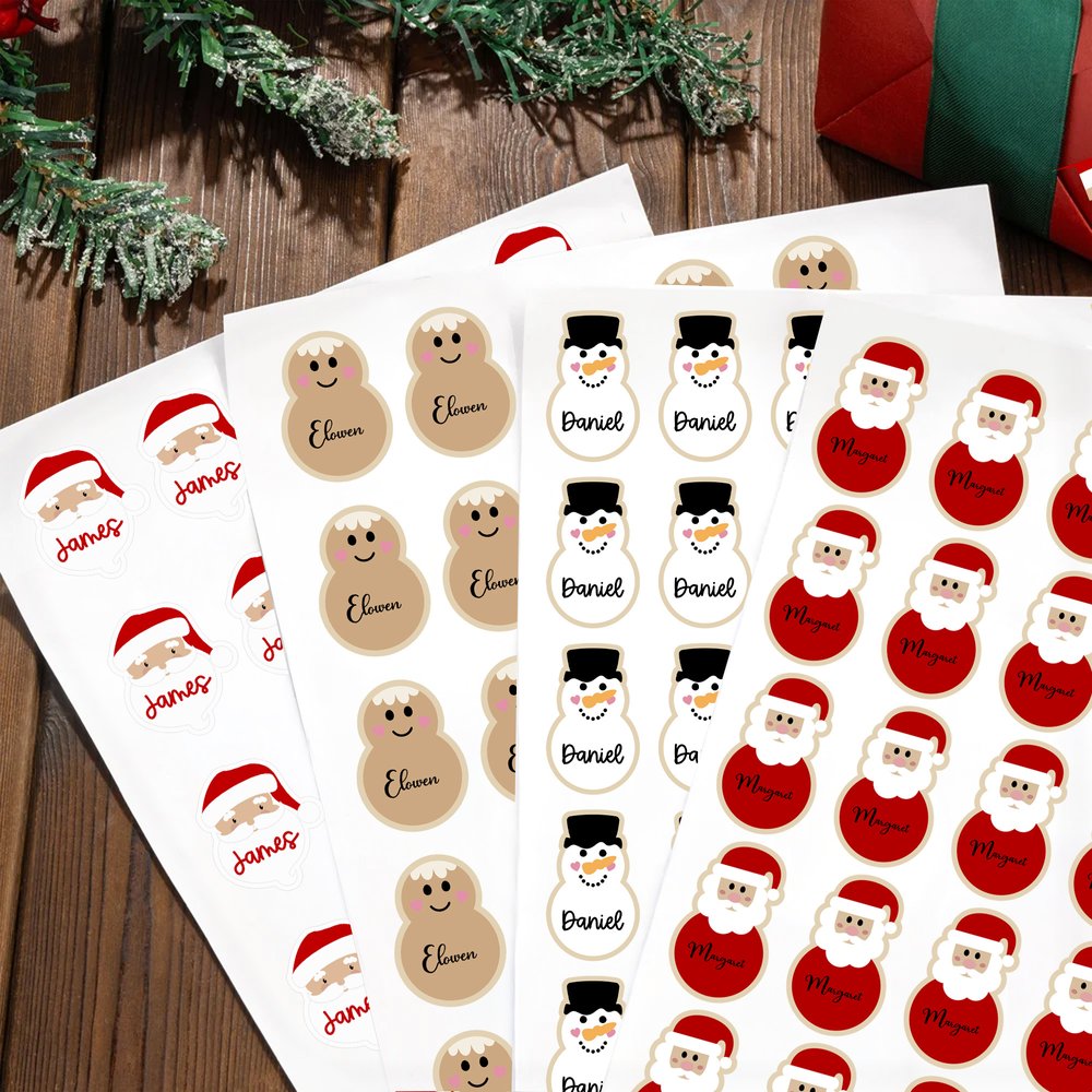 Ces autocollants de Noël présentent de charmants motifs de père Noël, d'élan, de bonhomme de neige et de bonhomme en pain d'épice. Vous pouvez également ajouter des noms pour une touche personnalisée, ce qui rend chaque autocollant cadeau unique.