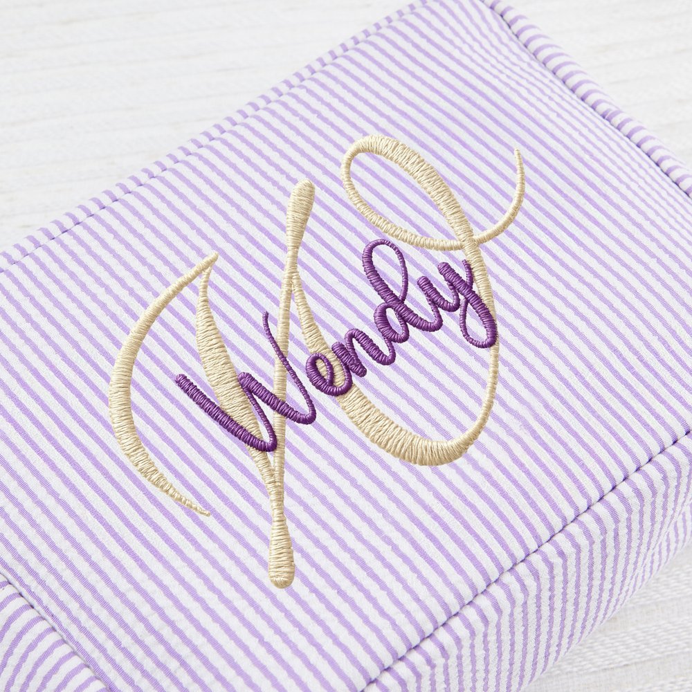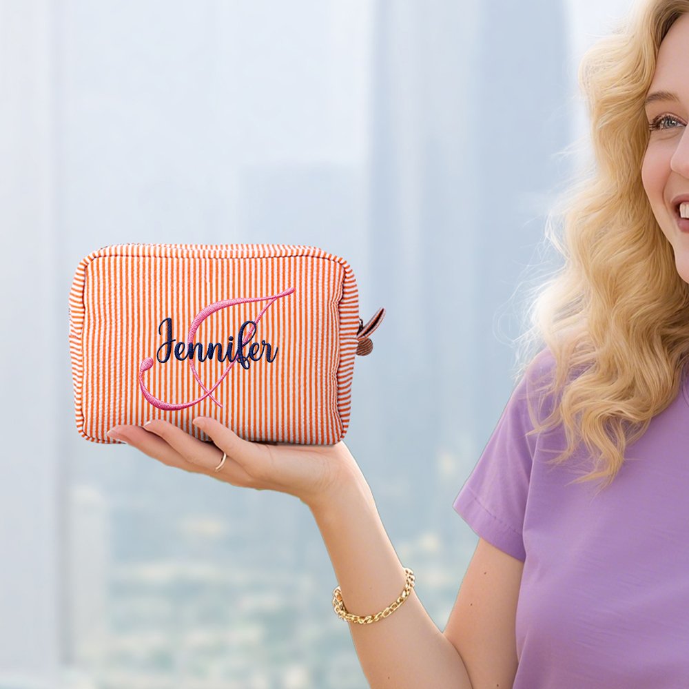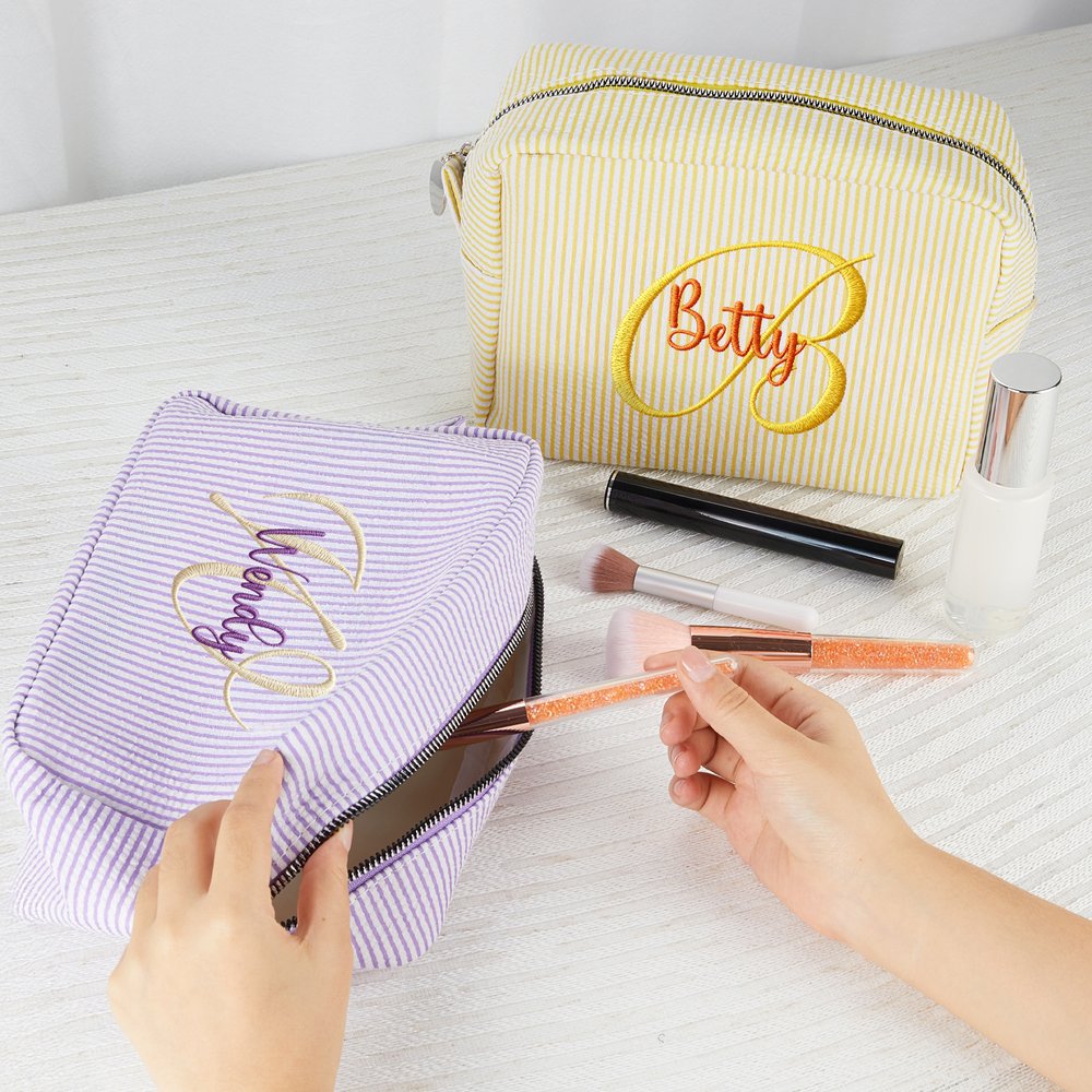 Dotée d'un motif à rayures classique et disponible en plusieurs couleurs, cette trousse de maquillage est à la fois élégante et chic. Chaque trousse peut être personnalisée avec un nom et une initiale grâce à une broderie délicate, la transformant ainsi en un accessoire unique et identifiable. En associant l'organisation pratique du maquillage à des détails personnalisés, cette pièce devient un article de rangement fonctionnel avec une touche personnelle distincte.