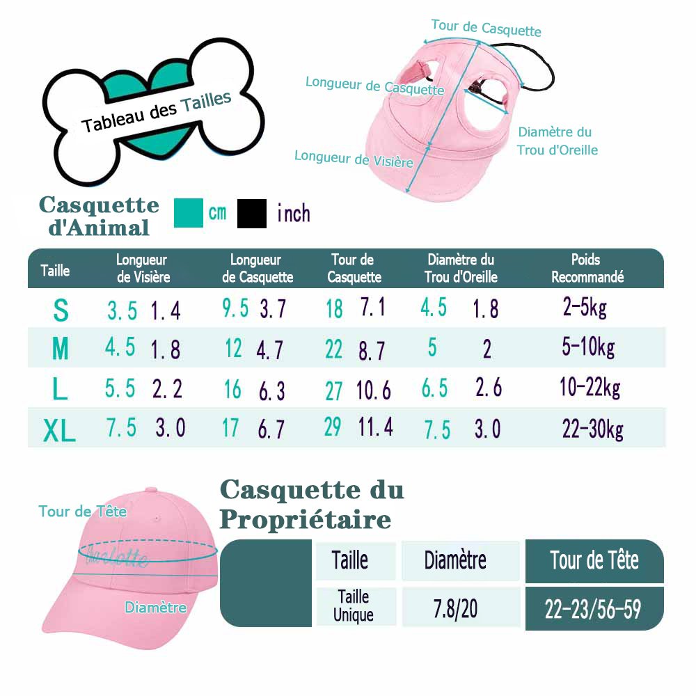| Mesure: | Tour de tête de la casquette du propriétaire - 22" - 23" (56cm - 59cm) ; Casquette pour animaux - S : Longueur du bord - 3,5 cm, M : Longueur du bord - 4,5 cm, L : Longueur du bord - 5,5 cm, XL : Longueur du bord - 7,5 cm |