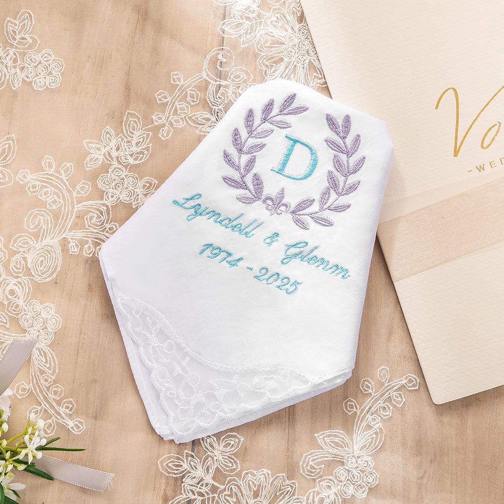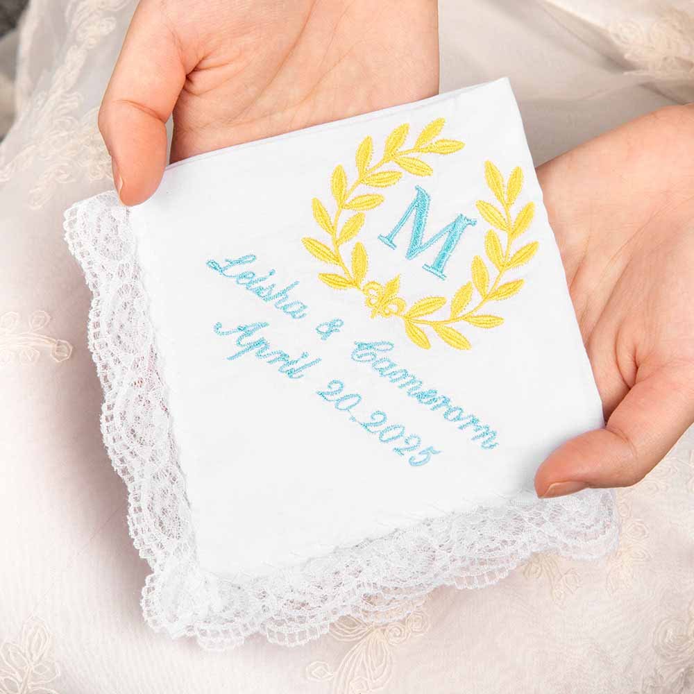 Mouchoir en Dentelle Personnalisé avec Nom Date et Initiale Brodés Linge 100% Coton Motif Branche d'Olivier Cadeau de Mariage pour Mariée