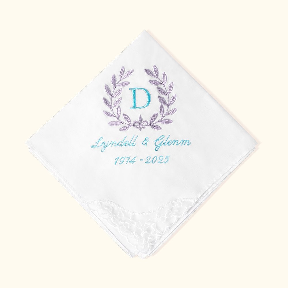 Ce mouchoir adopte des tons bleus classiques et des branches d'olivier. Les tons bleus classiques symbolisent la pureté et la beauté. Les branches d'olivier représentent de belles significations et des bénédictions telles que la paix, l'amour et la gratitude, et apportent une atmosphère romantique. La personnalisation d'une initiale, de noms et d'une date montre le charme unique de la mariée et laisse de profonds souvenirs.