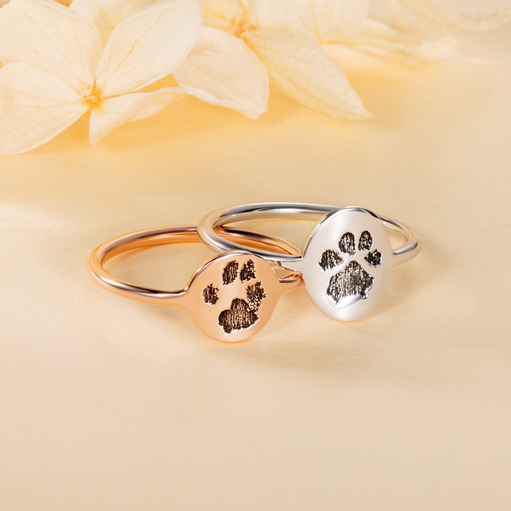 Cette bague peut être personnalisée avec l'empreinte de la patte et le nom de votre animal de compagnie, ce qui en fait une bague unique et significative et crée un souvenir vraiment unique et précieux.