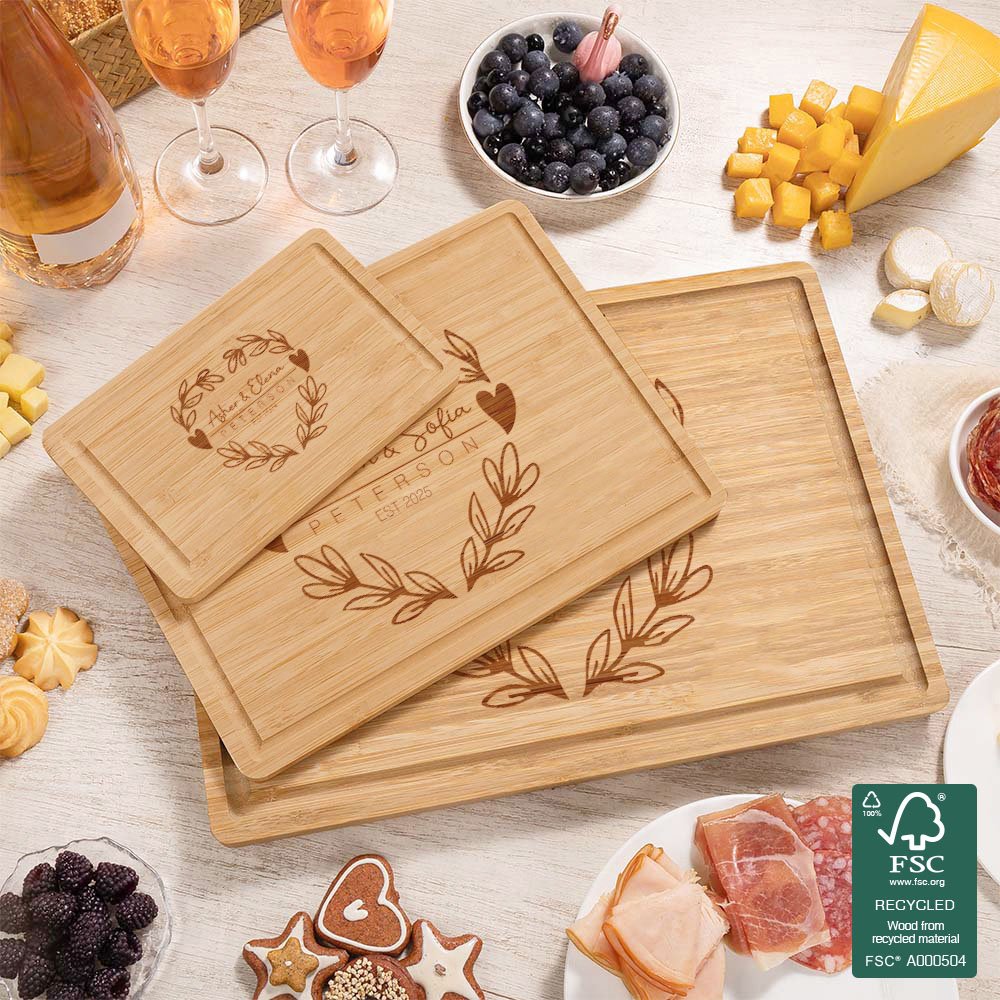 Cette planche à découper présente un design unique avec un élégant motif de couronne d'amour gravé au centre. Vous pouvez personnaliser votre nom, votre date et votre texte pour donner à la planche à découper un charme unique. Qu'il s'agisse d'un nom de famille, d'un nom de couple ou d'une date commémorative, cette planche à découper peut parfaitement refléter vos pensées et votre créativité, ajoutant une atmosphère chaleureuse et romantique à votre cuisine.
