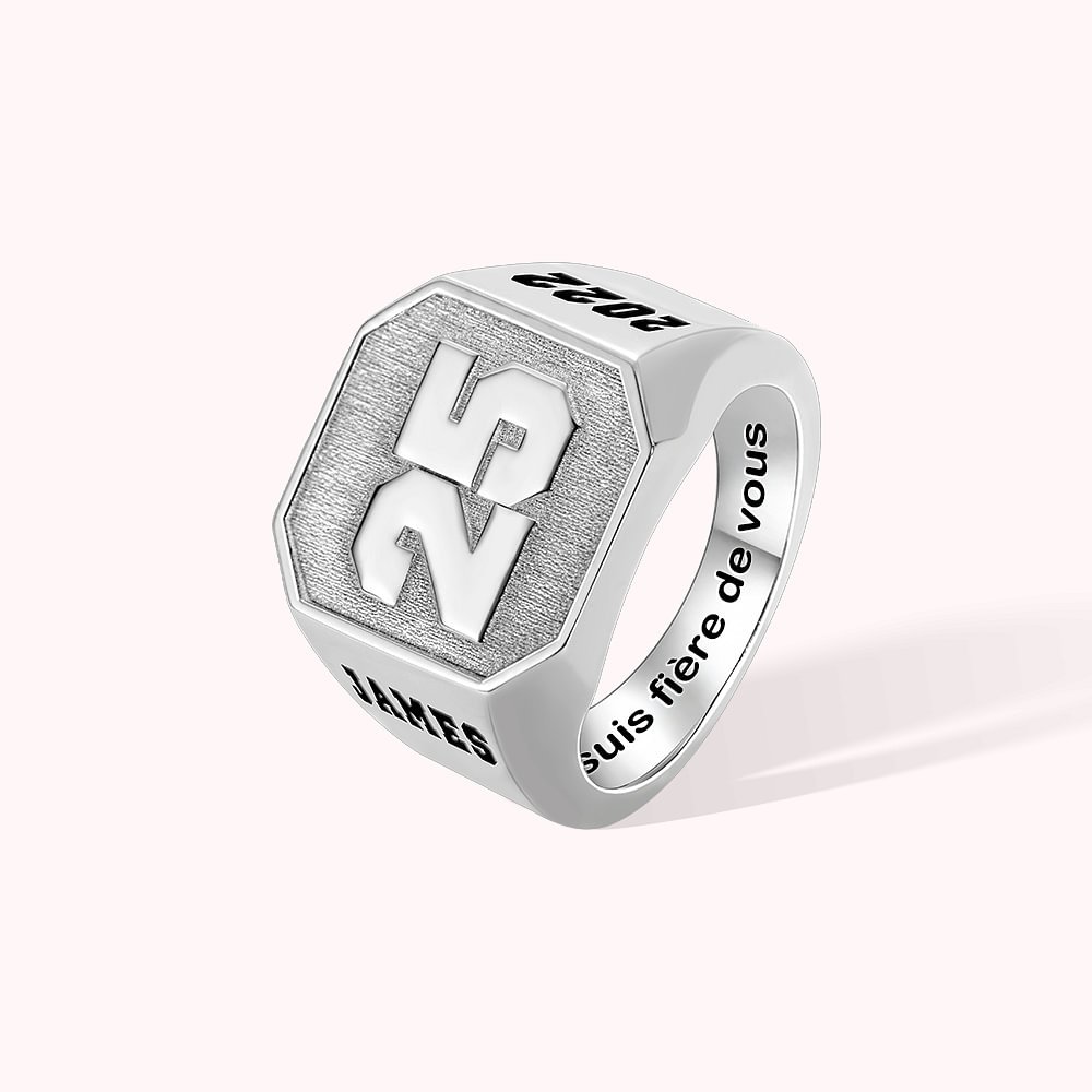 Avec ses lignes épurées et sa finition polie, notre chevalière sort du lot. Le numéro de l'équipe est mis en évidence sur le dessus de la bague, et les deux côtés de la bague, ainsi que la bande intérieure, peuvent être gravés avec le texte de votre choix. Qu'il s'agisse d'un nom, d'une date spéciale ou d'une phrase significative, ces gravures ajoutent une touche personnelle et sportive à la bague, ce qui en fait un bijou vraiment unique.