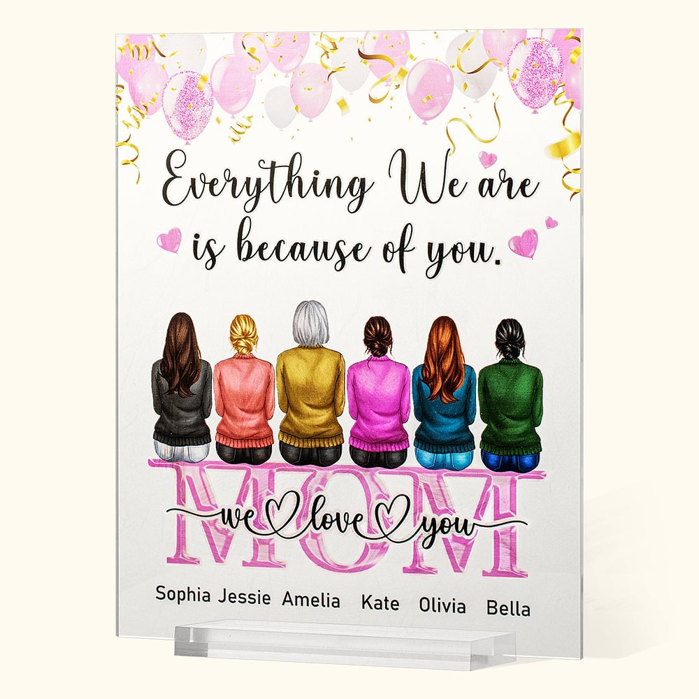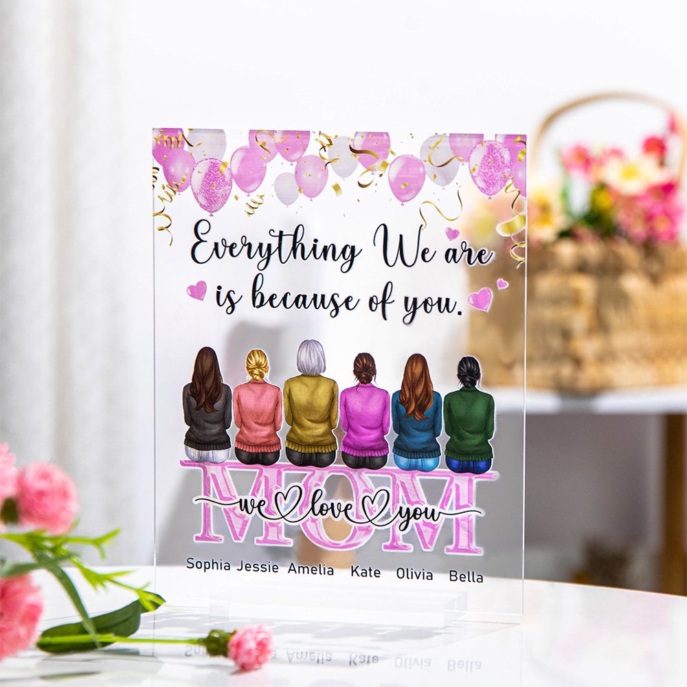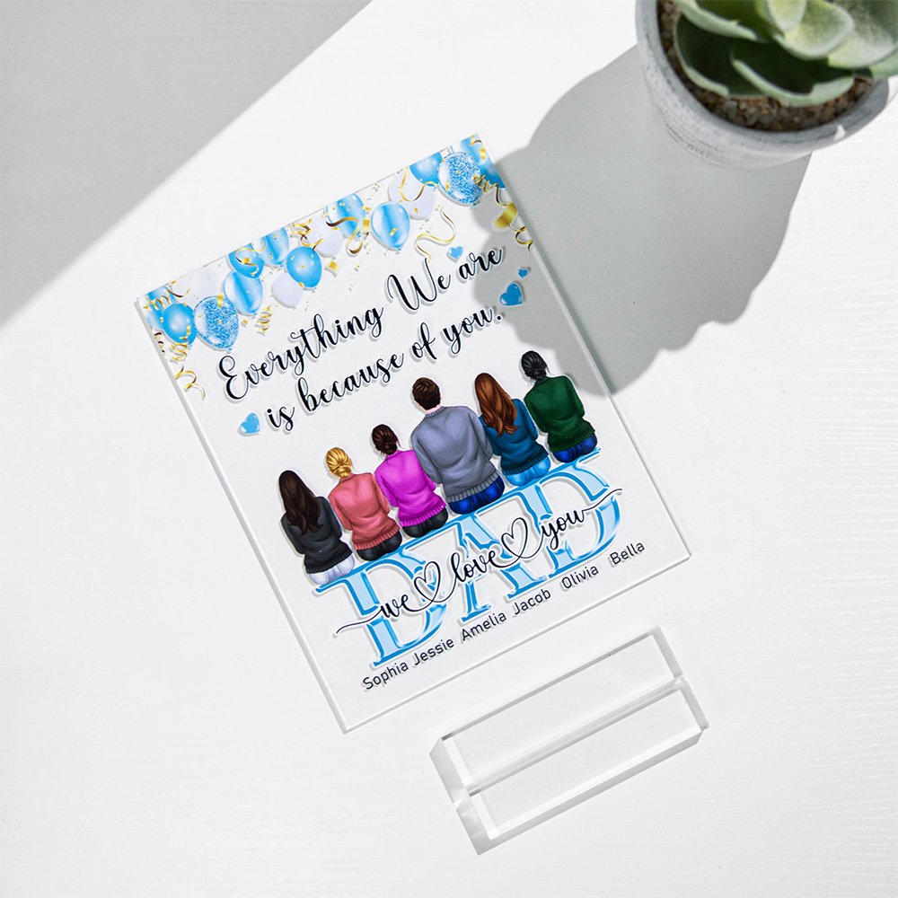 L'ornement de bureau est personnalisé avec le dos du membre de la famille, vous pouvez personnaliser le nombre de membres de la famille, les coiffures, créant une scène où tous les membres de la famille sont assis ensemble, rendant une atmosphère familiale chaleureuse. Avec le texte "Tout ce que nous sommes grâce à toi", c'est le cadeau le plus attentionné et le plus significatif pour votre bien-aimé.