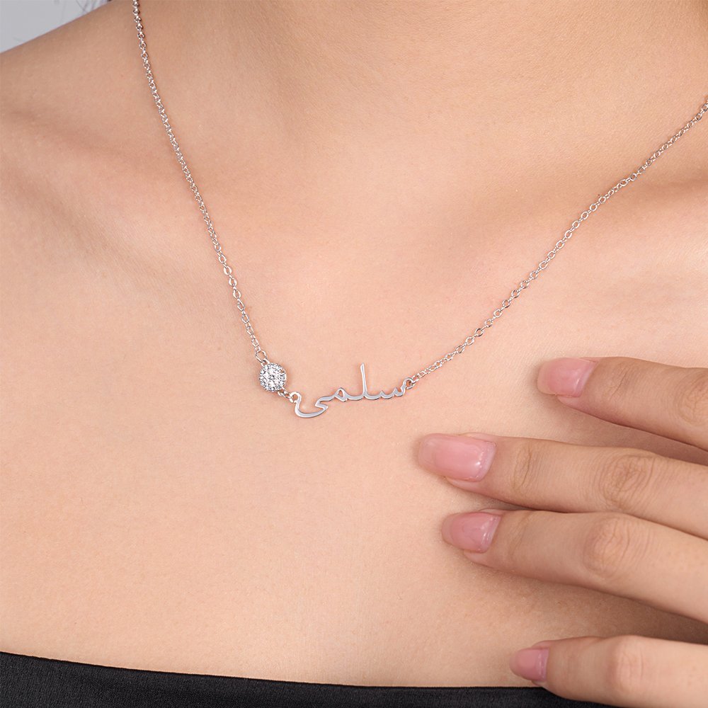 Ce collier représente l'emblématique mauvais œil et est conçu pour éloigner les énergies négatives tout en mettant en valeur votre nom unique dans une élégante écriture arabe. Le nom arabe personnalisé ajoute une touche distinctive, vous permettant d'exprimer votre identité tout en portant une pièce significative.