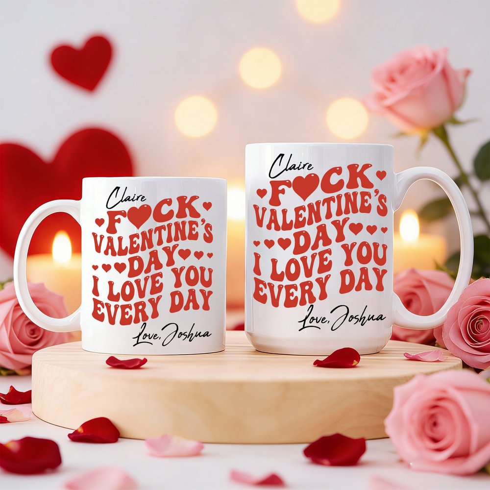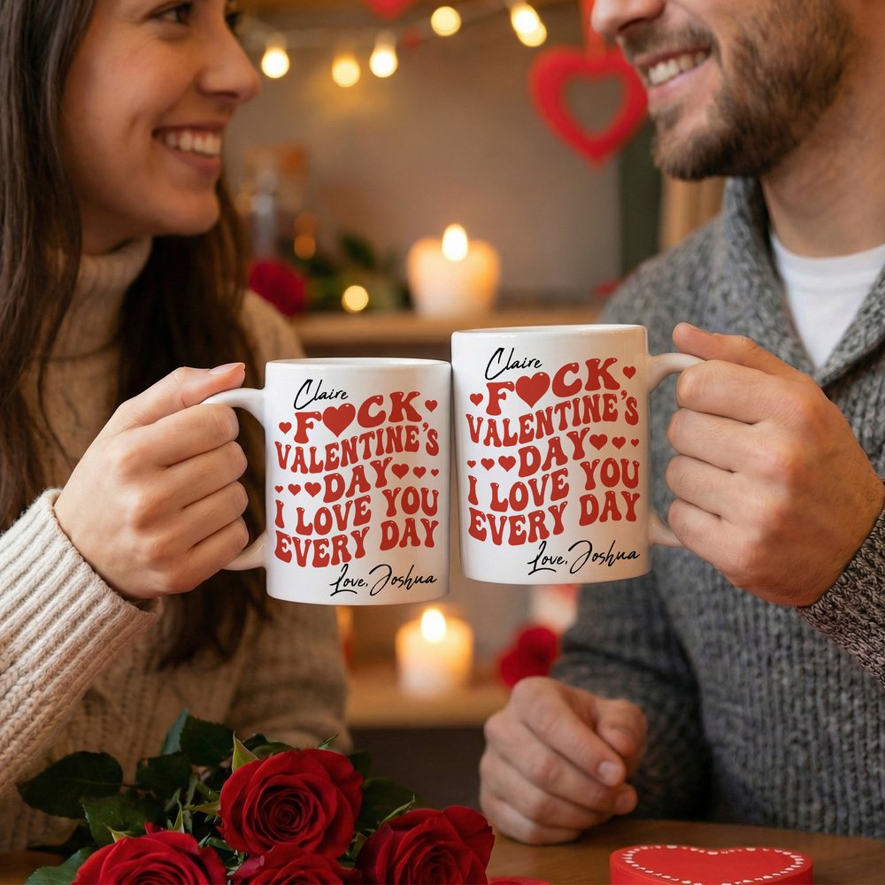 Un mug élégant d'inspiration vintage qui affirme haut et fort : "Au diable la Saint-Valentin, je t'aime tous les jours". Avec son lettrage rétro audacieux, ses cœurs ludiques et la possibilité de personnaliser les noms, ce mug transforme l'affection quotidienne en un objet qui attire instantanément l'attention.