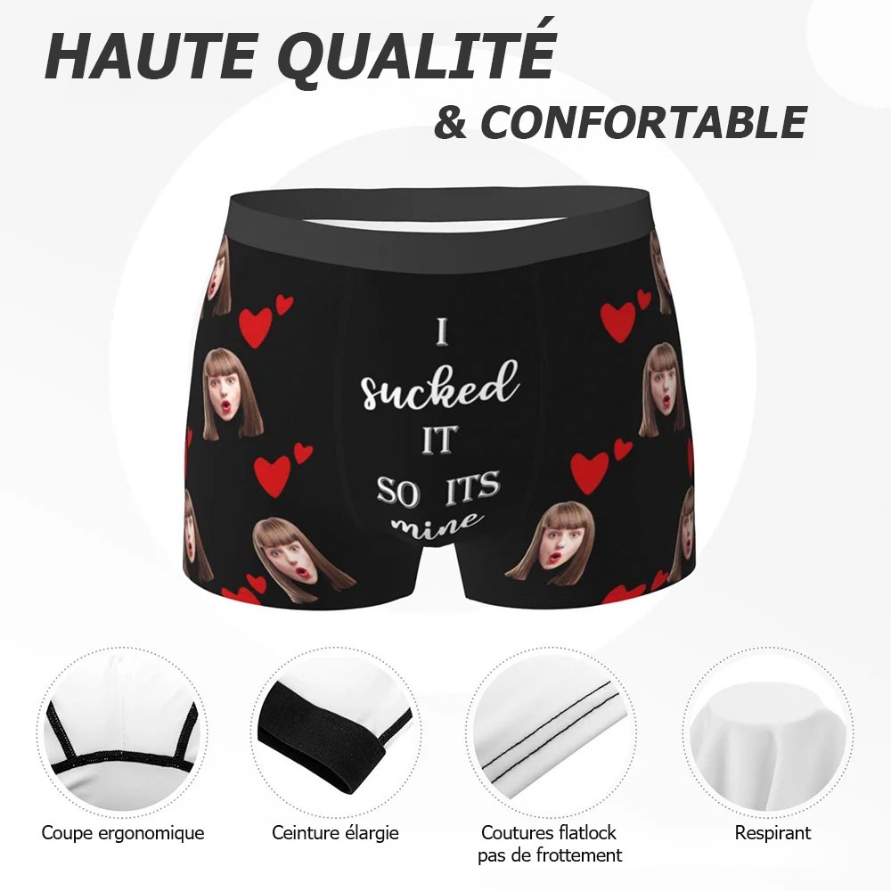 Le message « Je l'ai sucé donc c'est le mien » sur le boxer ajoute une touche ludique et insolente. Associé aux cœurs d'amour, il crée une atmosphère amusante et légère. C'est une façon délicieuse d'exprimer votre sens de l'humour et de montrer à votre partenaire que vous l'aimez.