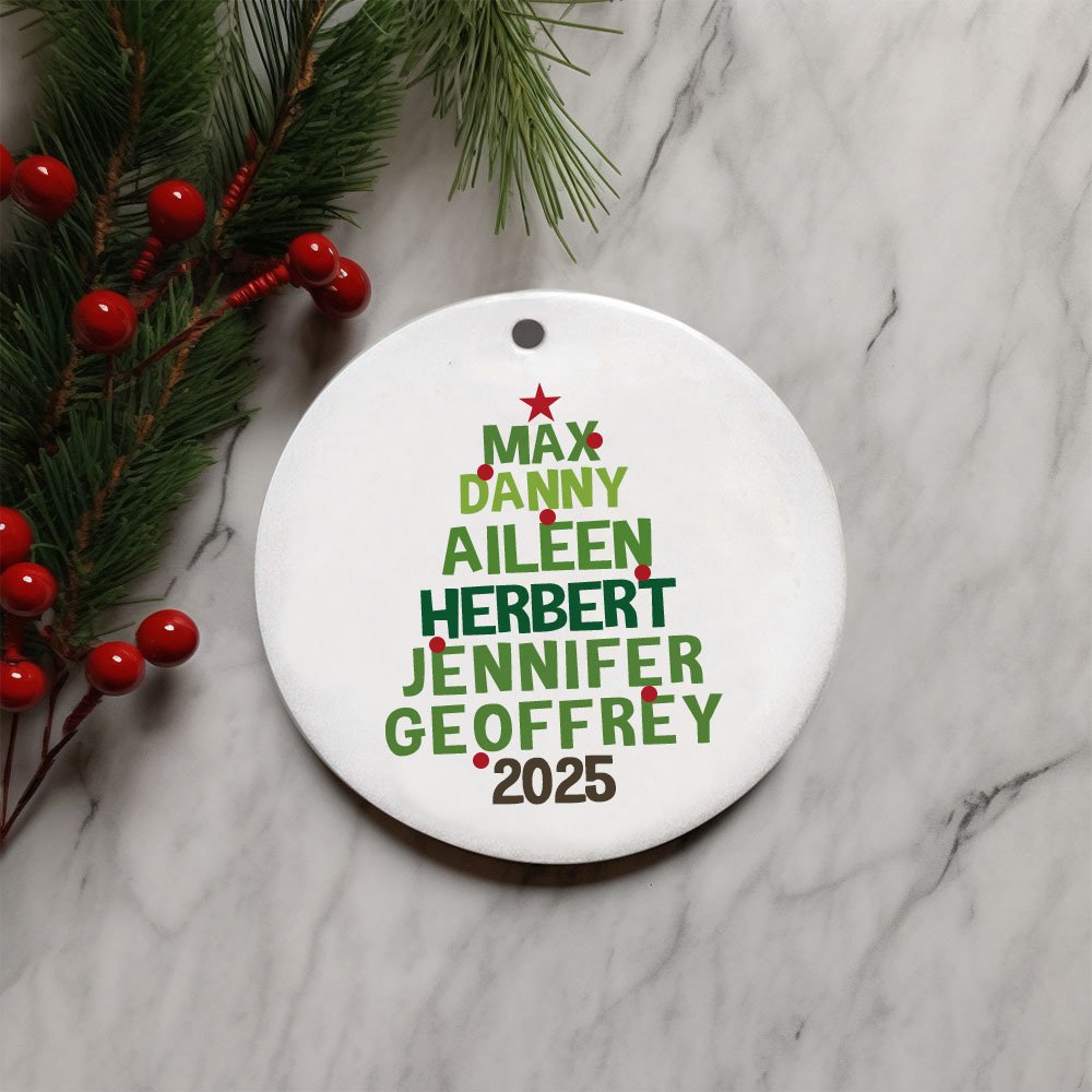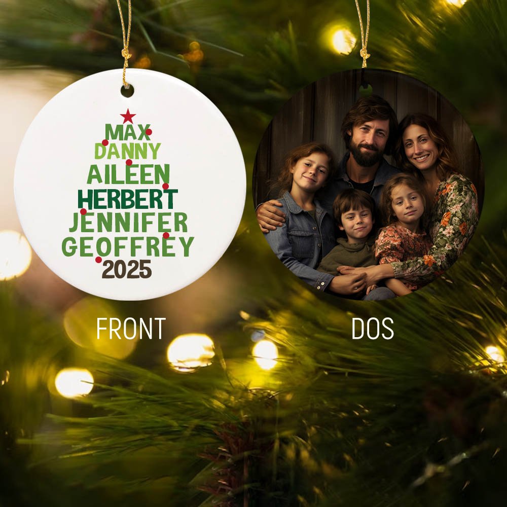 Notre décoration est fabriquée en porcelaine blanche ronde, d'excellente qualité et bien faite. L'ornement comprend un cordon pour le suspendre. Nous proposons des options d'impression recto et recto-verso. Simple face : le nom du membre de la famille est imprimé sur le devant ; double face : le nom du membre de la famille est imprimé sur le devant et la photo du membre de la famille est imprimée au dos.