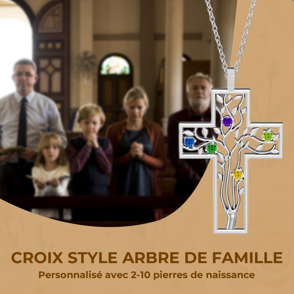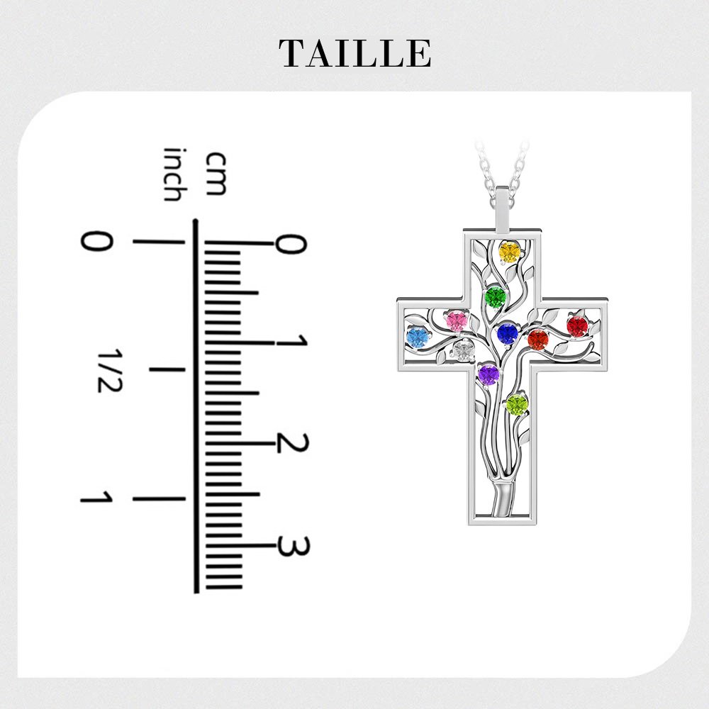 Ce superbe collier mélange avec art trois symboles significatifs : l'arbre généalogique, qui représente les liens générationnels ; la croix, qui incarne la foi chrétienne ; et 2 à 10 pierres de naissance, qui ajoutent une signification personnelle. Ensemble, ils créent une célébration unique de la famille, de la spiritualité et de l'individualité.