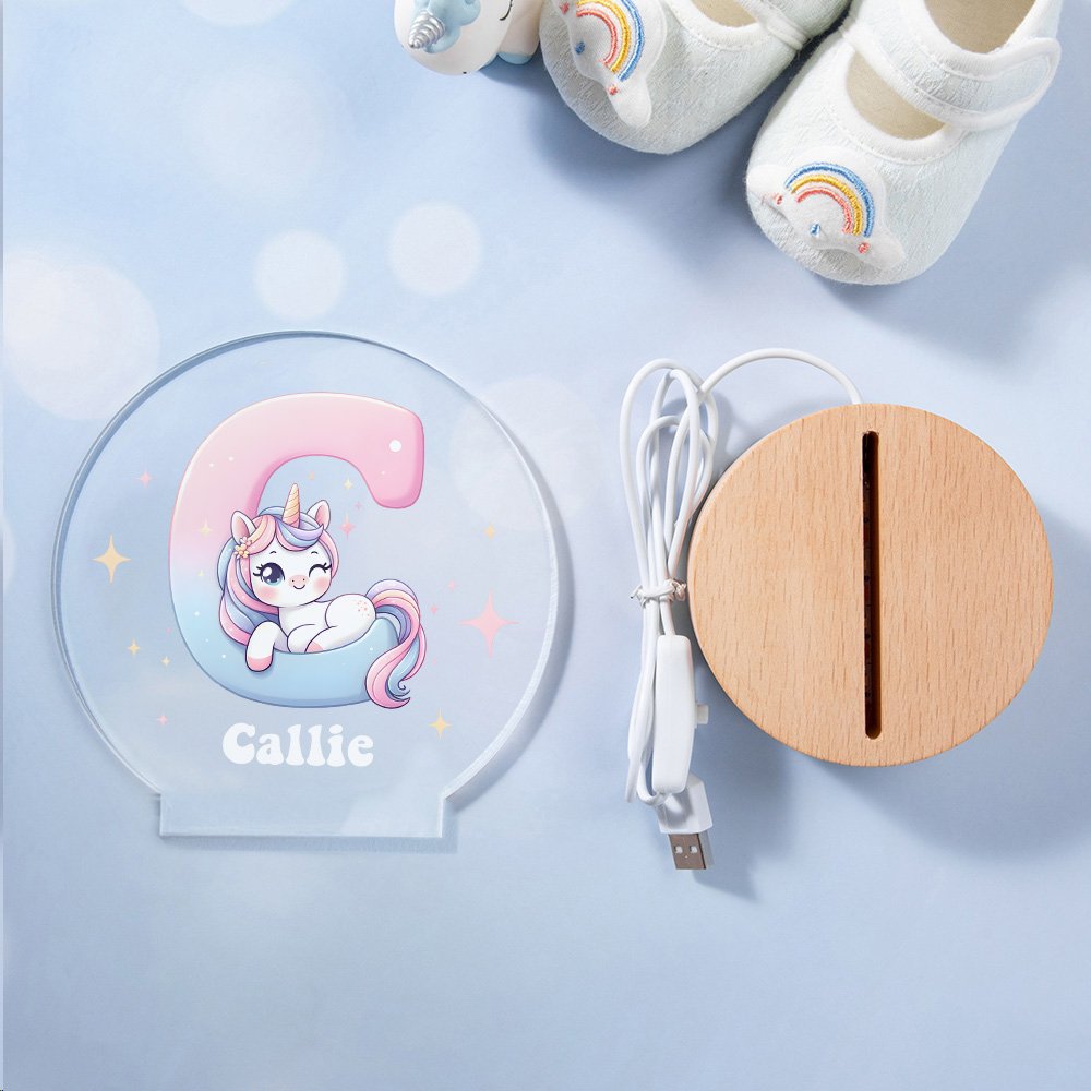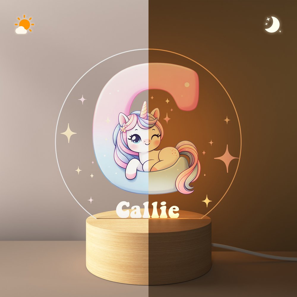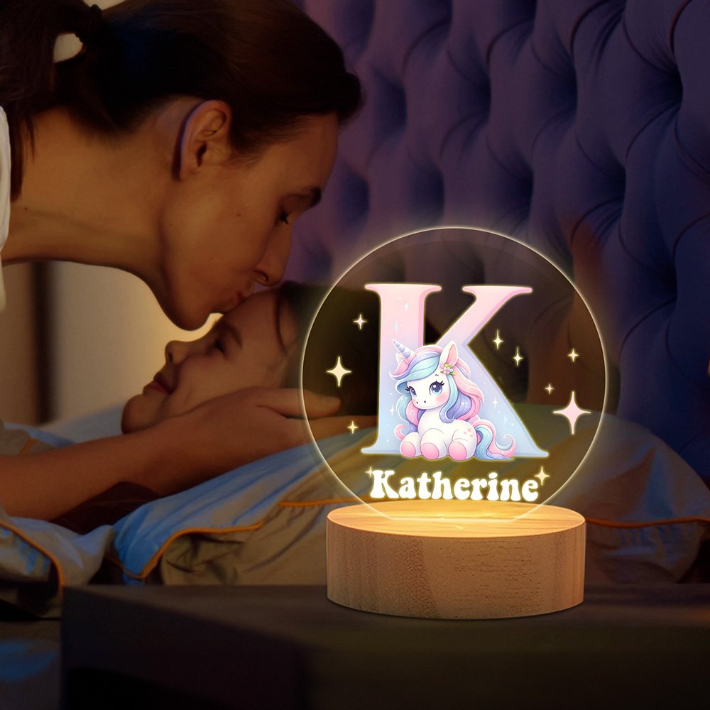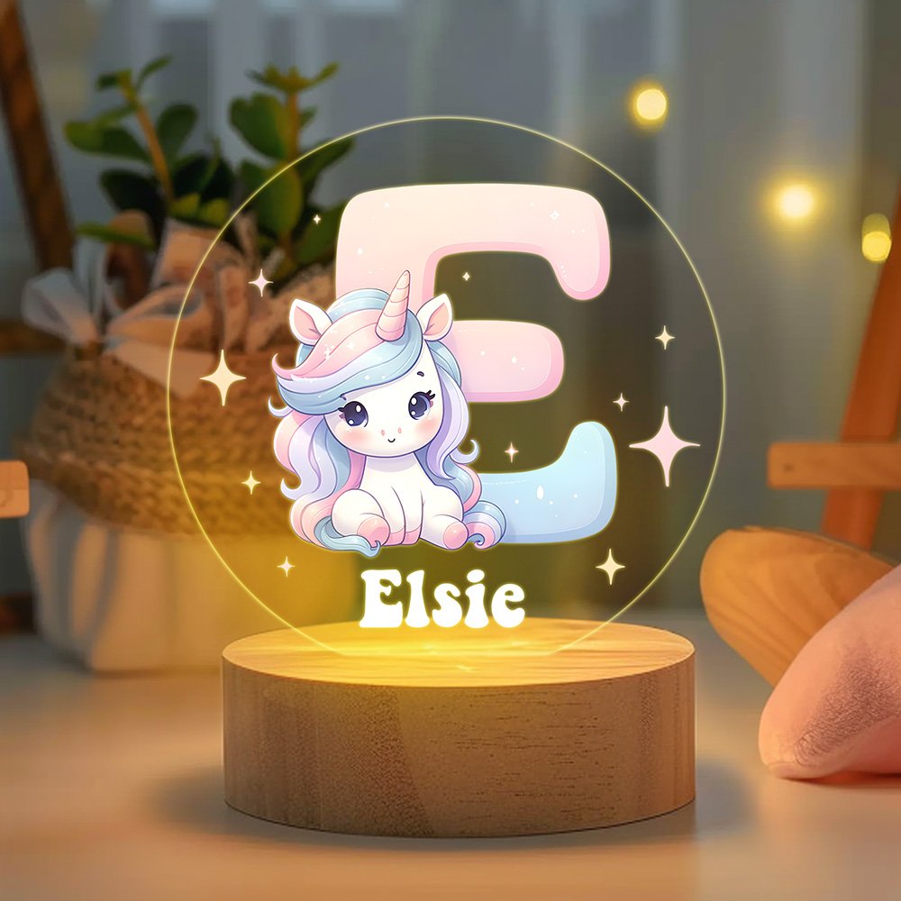Notre veilleuse présente un motif fantastique de licorne et de lettres, entouré d'étoiles à quatre branches de différentes tailles, qui est simple et mignon. Vous pouvez personnaliser le motif avec le nom et les initiales de votre enfant pour créer une atmosphère unique et magique qui lui appartient.
