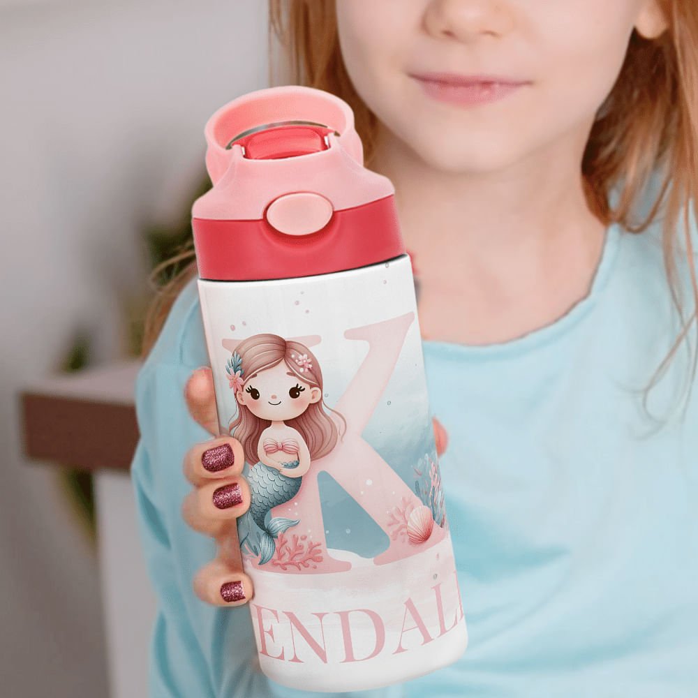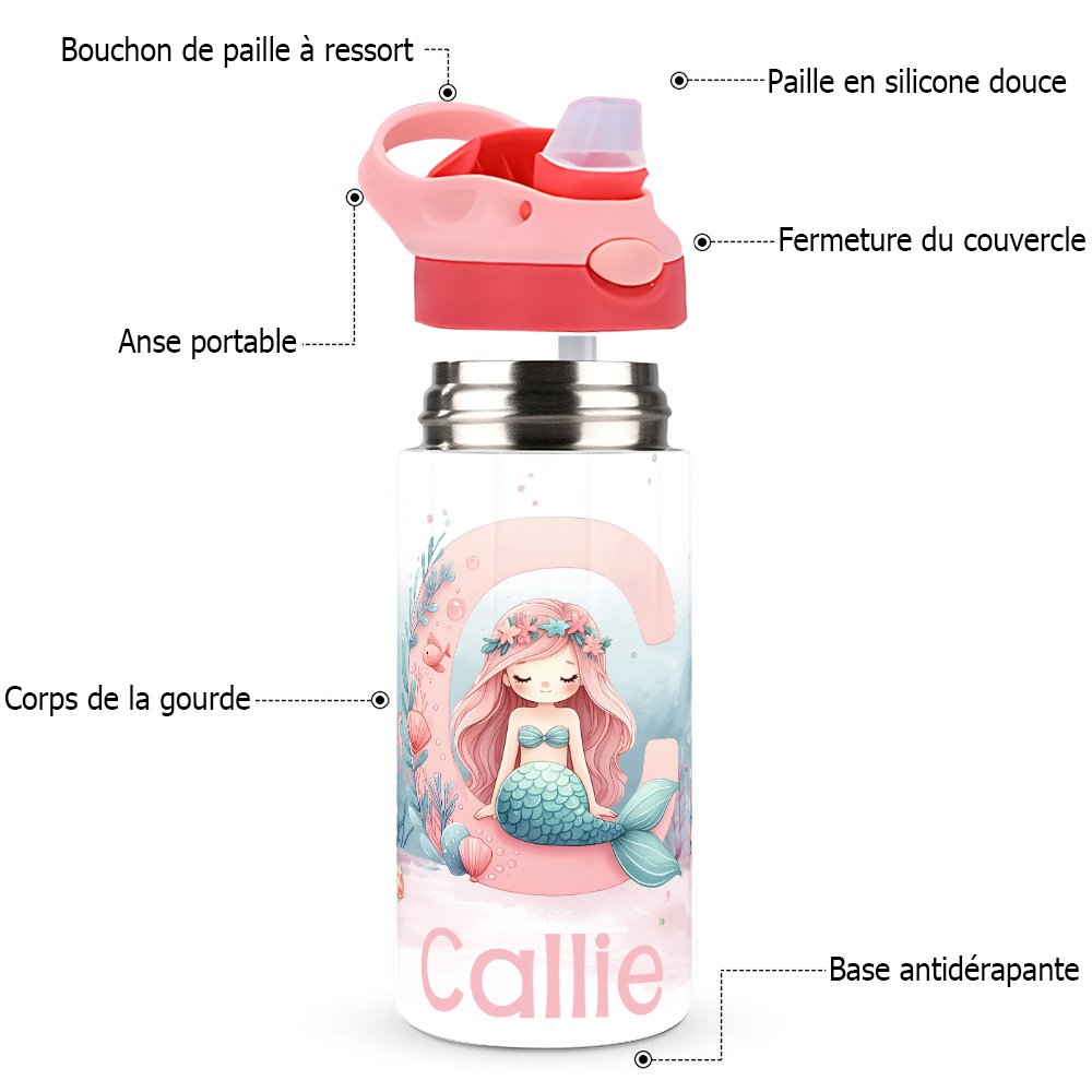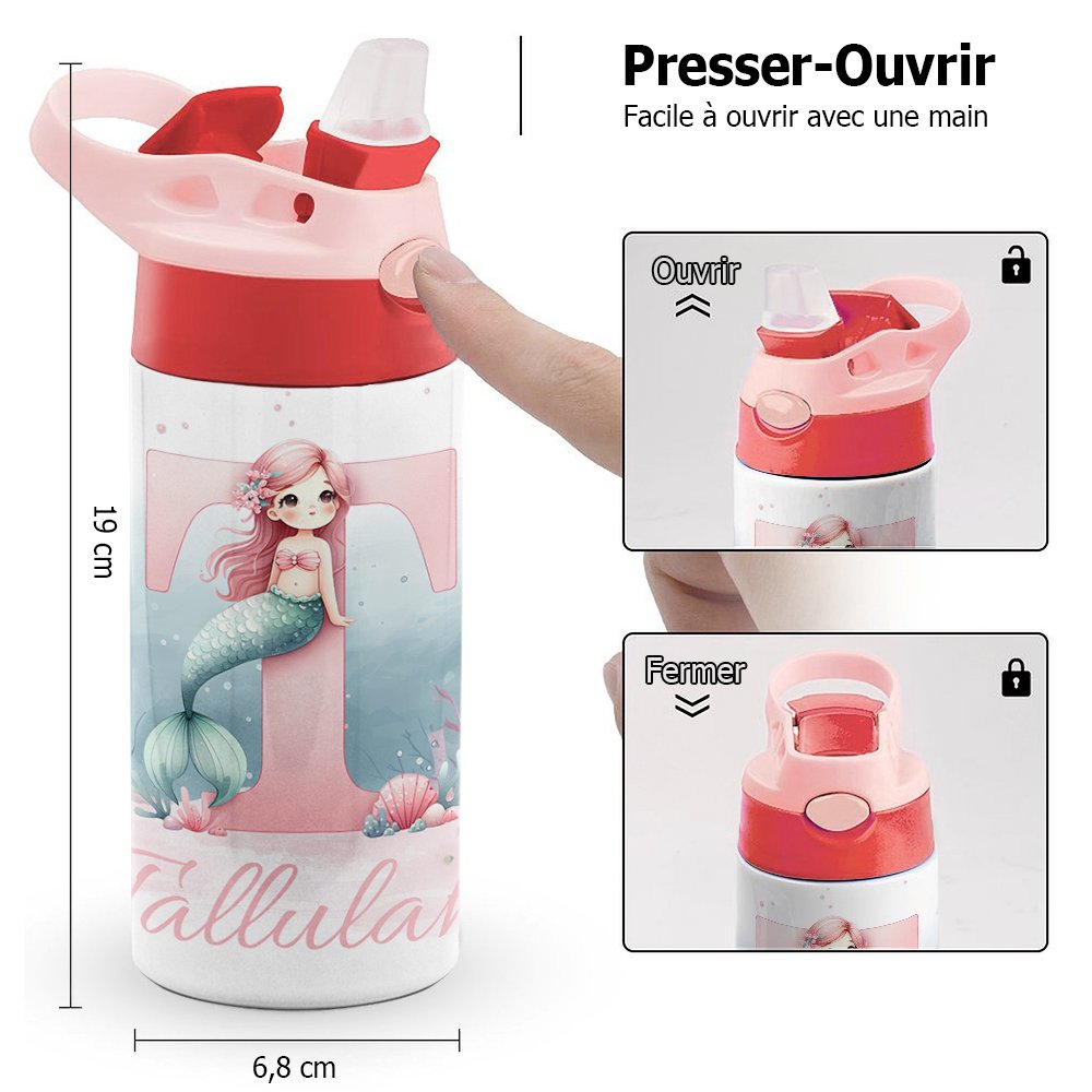 Cette bouteille d'eau sur le thème des sirènes intègre parfaitement les éléments oniriques du monde marin dans son design. La bouteille est décorée de motifs de sirènes ludiques, avec 26 motifs au choix. Les couleurs douces et l'aspect enfantin de cette bouteille la rendent particulièrement adaptée aux petites filles qui aiment l'océan et les sirènes. Vous pouvez choisir vos initiales et votre nom pour faire de cette gourde un objet unique pour votre enfant.