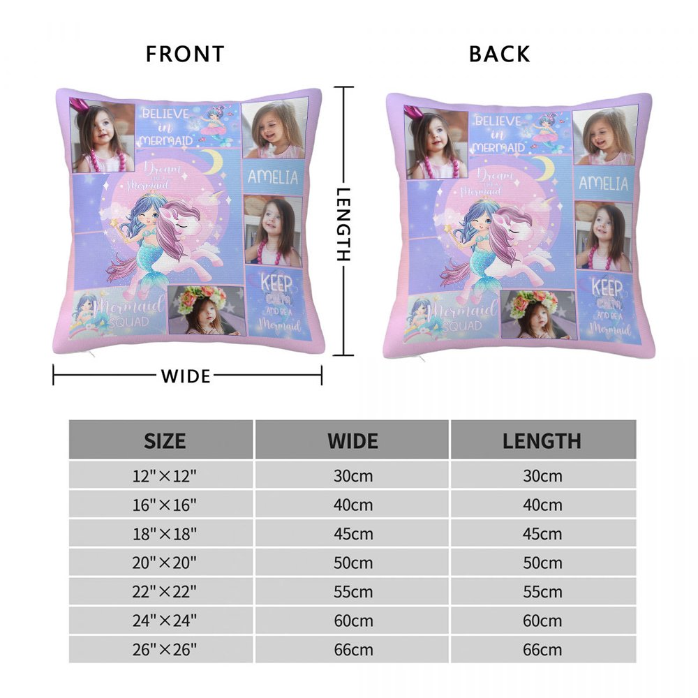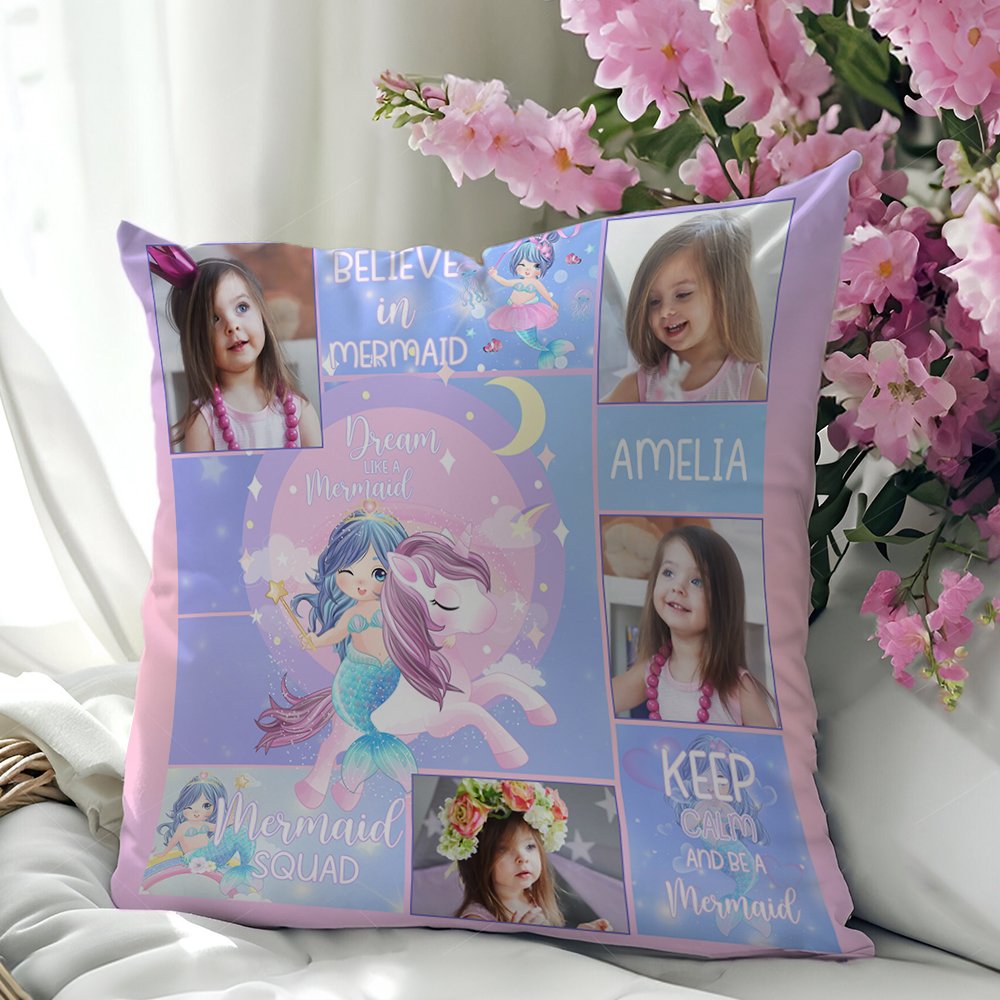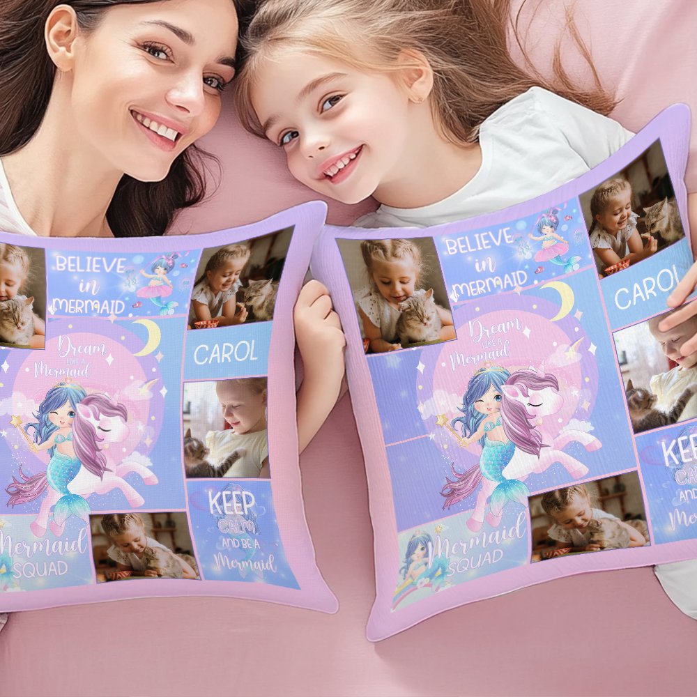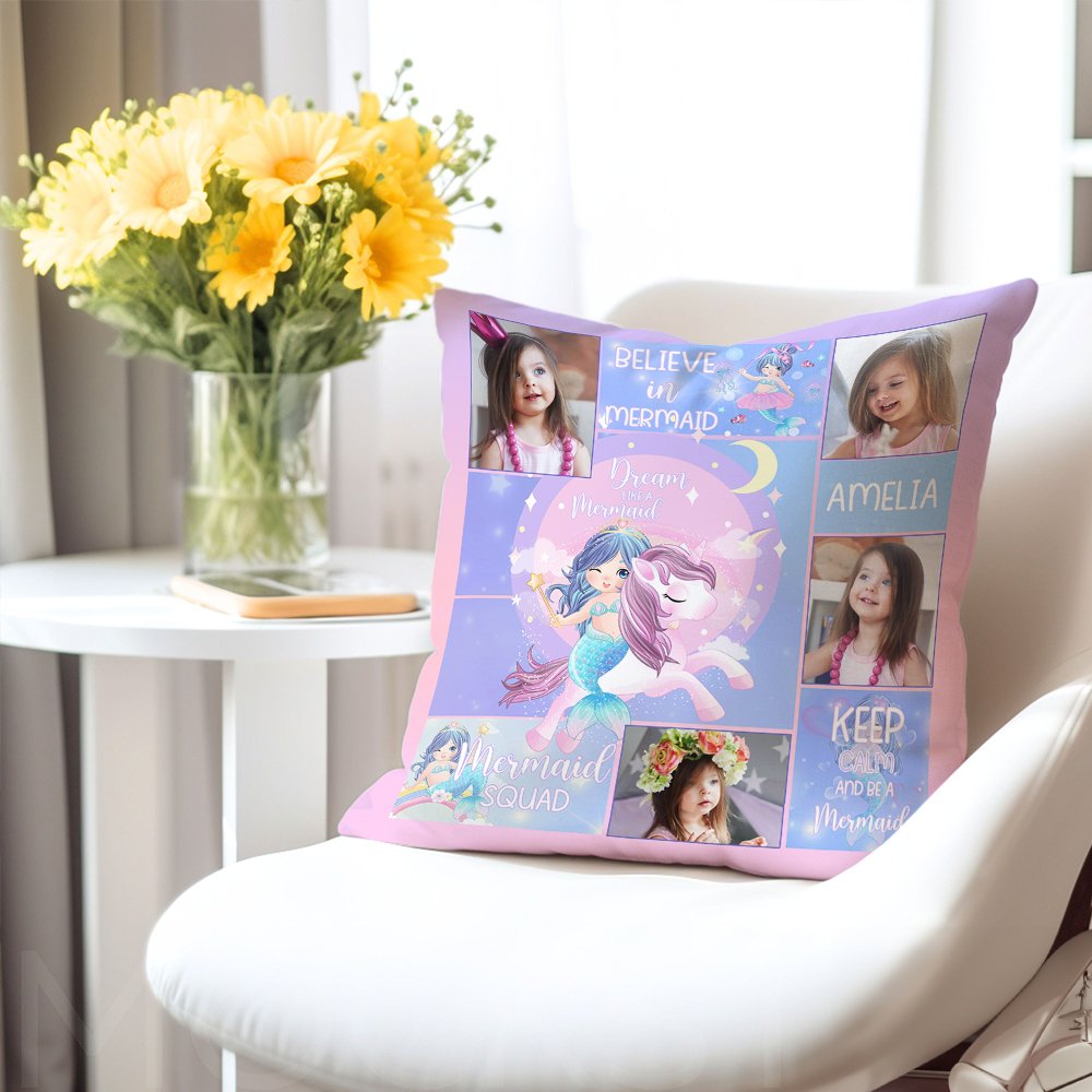 Cette housse de coussin présente de charmants éléments de sirène et un arrière-plan fantastique qui capte l'imagination de l'enfant. Les charmants motifs, accompagnés d'un nom personnalisé et d'un motif à quatre photos personnalisable, en font un cadeau idéal pour toute petite fille.