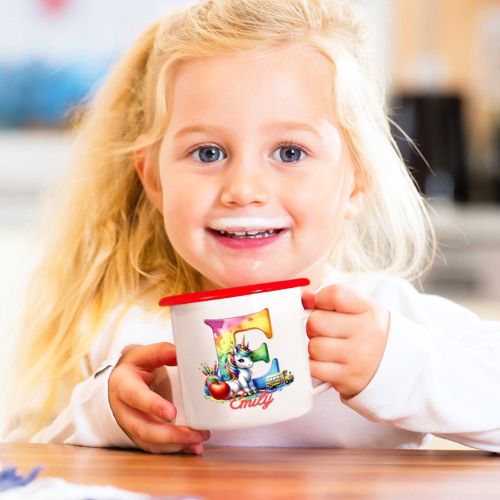 Cette tasse présente un motif de licorne fantastique associé à des lettres dégradées enchanteresses, ajoutant une touche de créativité fantaisiste. Le bord de la tasse est disponible en six couleurs, pour répondre aux différentes préférences. En outre, la tasse peut être personnalisée avec le nom de l'enfant et l'initiale, ce qui en fait un objet unique à utiliser au quotidien.