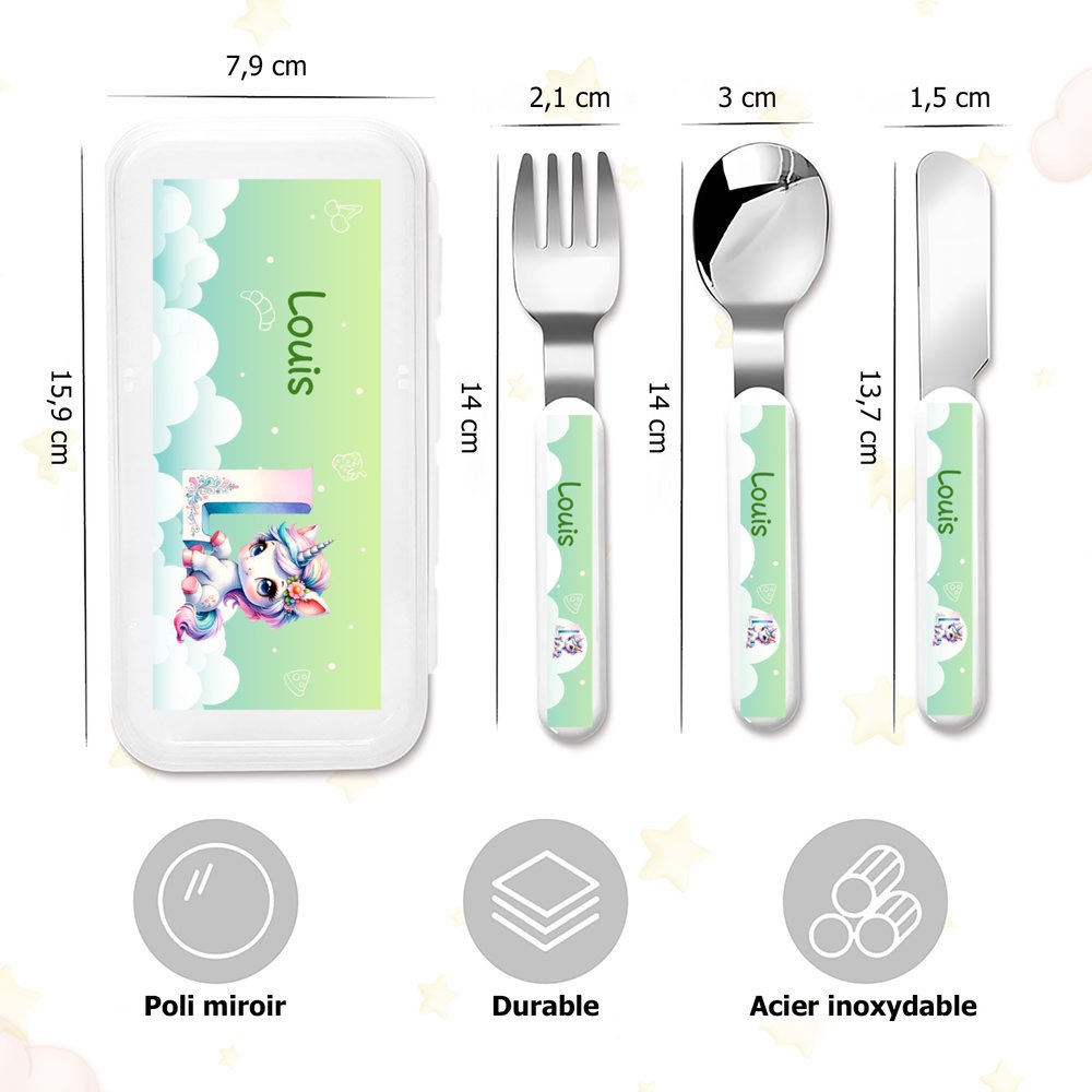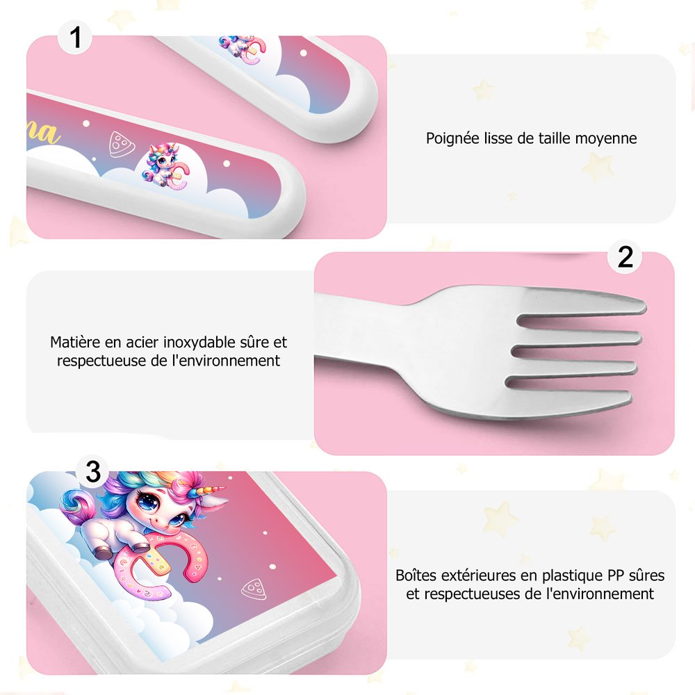 Avec une licorne fantastique de dessin animé comme élément principal, vous pouvez choisir parmi 26 initiales de licorne fantastique de dessin animé et 6 couleurs d'arrière-plan. Vous pouvez également personnaliser le nom (2 polices en option, 8 couleurs de police). Qu'il s'agisse d'une licorne vivante ou d'une couleur de rêve assortie, les couverts peuvent devenir un "compagnon de repas" pour les enfants.