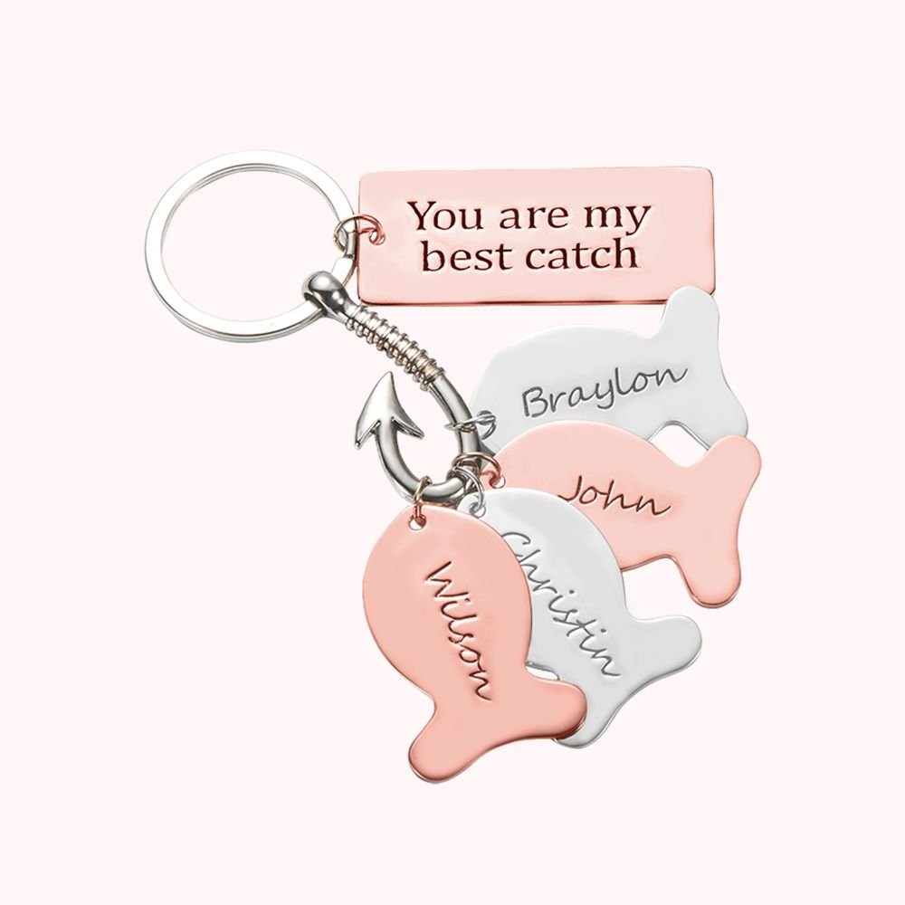 Le porte-clés «Hook on Dad» est un cadeau parfait pour le pêcheur de la maison. Nombre de breloques de poisson au choix, avec les prénoms des enfants gravés sur chacune breloque. Un cadeau significatif pour votre père, votre grand-père ou tout homme spécial dans votre vie.