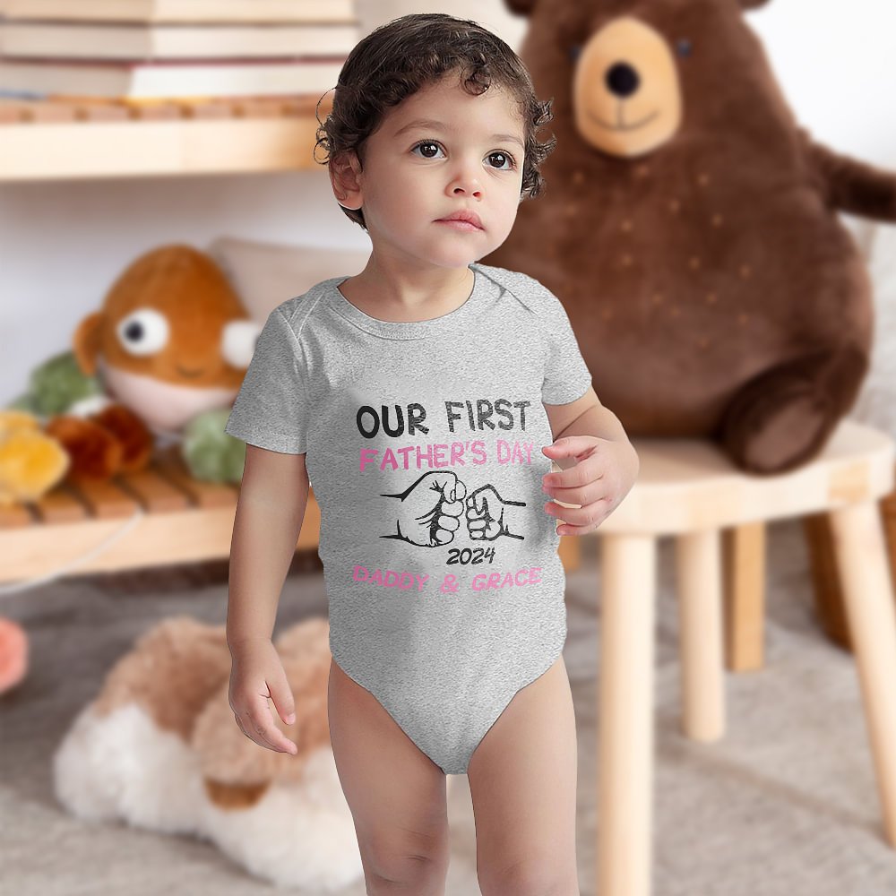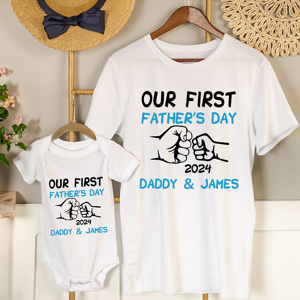Ensemble bébé-père assorti, imprimé avec les mots chaleureux "Notre première fête des pères", symbolisant la relation inséparable entre le père et le fils, montrant les moments chaleureux entre parents et enfants. Vous pouvez également imprimer le nom de l'enfant et du père ainsi qu'une année spéciale sur les vêtements pour rendre cette grenouillère encore plus unique.