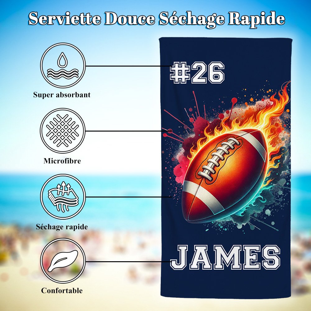 Avec ses effets de flamme uniques et son motif de ballon de sport, cette serviette de plage propose 11 motifs de ballon de sport différents, dont le rugby, le basket-ball, le golf, le football, etc., chacun avec un motif de flamme accrocheur pour montrer le mouvement et la personnalité. Vous pouvez également personnaliser votre nom et votre numéro sur la serviette de plage, ce qui fait de cette serviette de plage une identité personnelle unique.