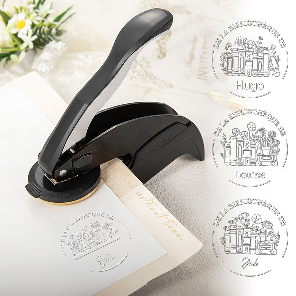 Cette machine à embosser présente des livres et des fleurs comme éléments de conception principaux, associés à des noms et des textes personnalisables, créant ainsi un style général simple et élégant, mais distinctif. Le motif du livre reflète l'identité des amoureux des livres, tandis que les éléments floraux ajoutent une touche de beauté délicate. La conception unique garantit que les motifs en relief sont clairs et tridimensionnels, ce qui vous permet de marquer des livres, des lettres et d'autres objets avec un tampon personnalisé sans les abîmer, faisant de chaque utilisation un rituel spécial.