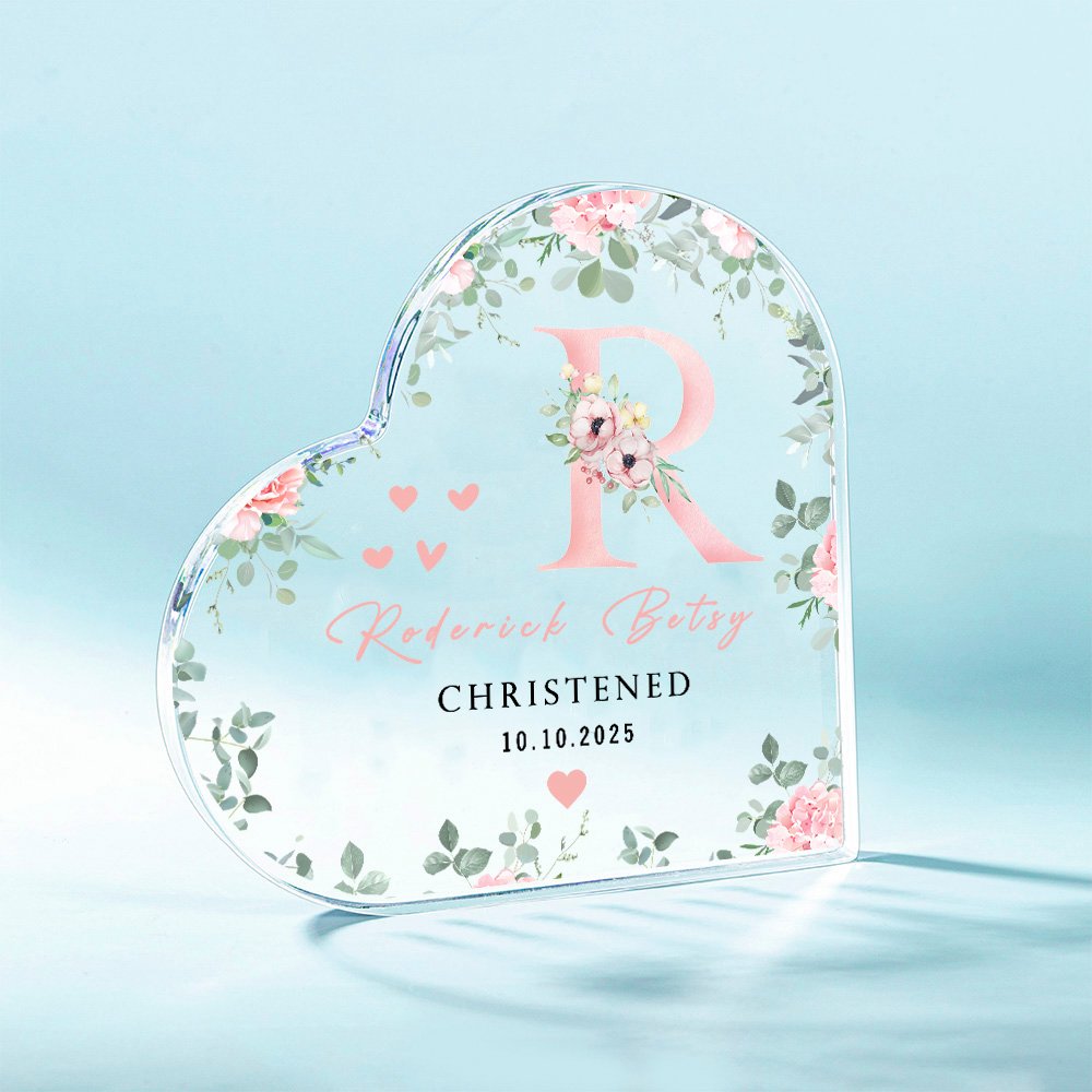 Cette plaque en forme de cœur se distingue par son design floral unique et sa personnalisation. Elle utilise un ton rose doux avec des feuilles et des fleurs vertes délicates pour créer une atmosphère chaleureuse et élégante. La décoration permet également de personnaliser le nom, les initiales, la date et le texte, et le petit motif en forme de cœur qui l'entoure ajoute de la douceur et de l'amour, rendant l'ensemble du design parfait.