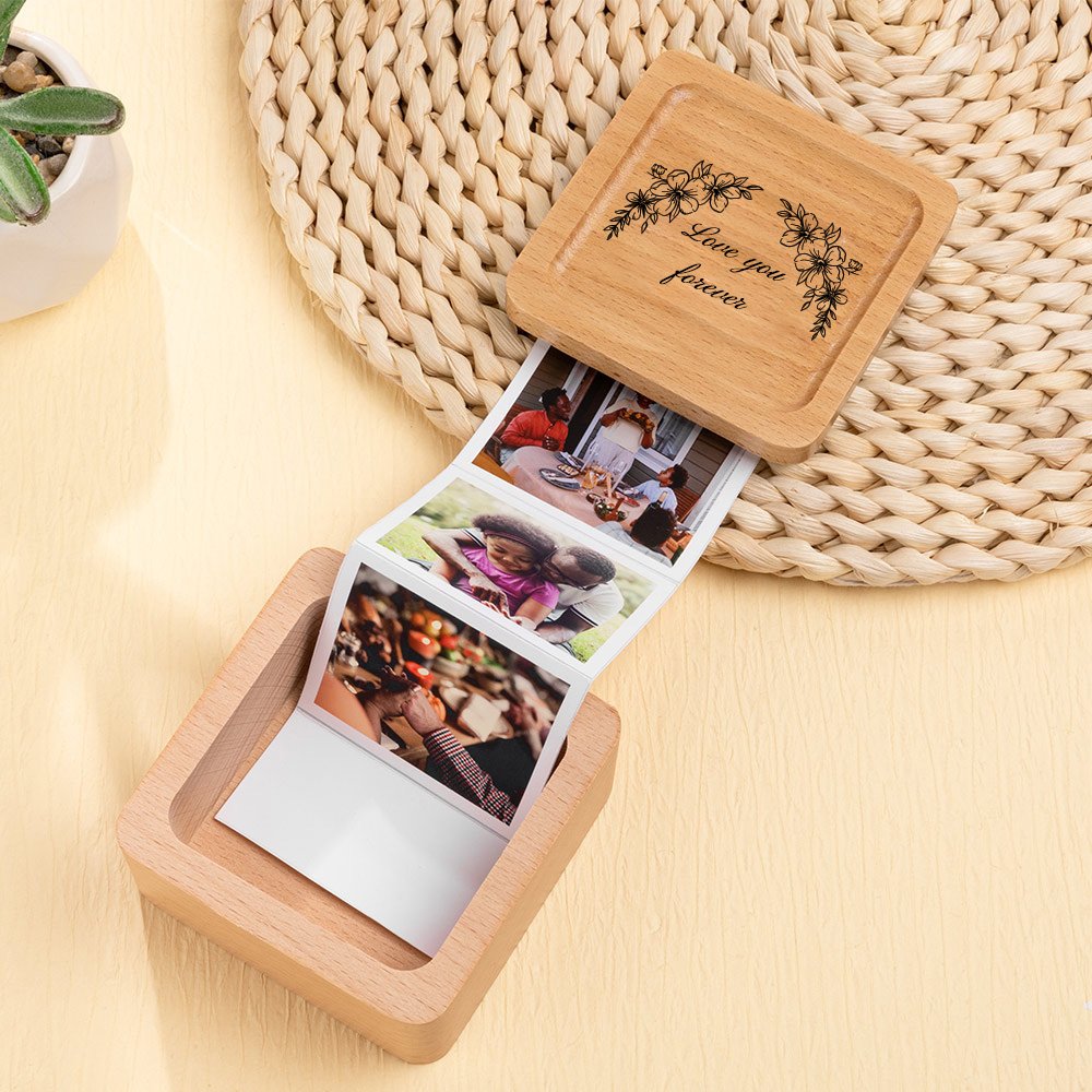 Cette boîte à photos se distingue par son mécanisme innovant d'extraction. Elle peut contenir de 2 à 14 photos en accordéon, ce qui vous permet de conserver vos précieux souvenirs en un seul endroit. Lorsque vous tirez la partie intérieure, les photos se déploient comme une histoire, révélant chaque moment précieux individuellement. Cette conception interactive en fait non seulement une boîte de rangement, mais aussi un moyen agréable de revivre des souvenirs.